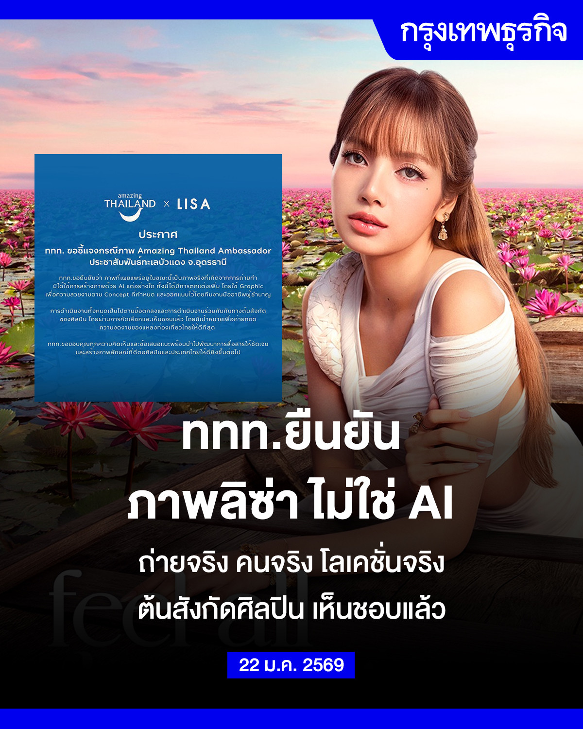 ททท.ยืนยัน ภาพลิซ่า ไม่ใช่ AI ถ่ายจริง คนจริง โลเคชั่นจริง ต้นสังกัดศิลปิน เห็นชอบแล้ว