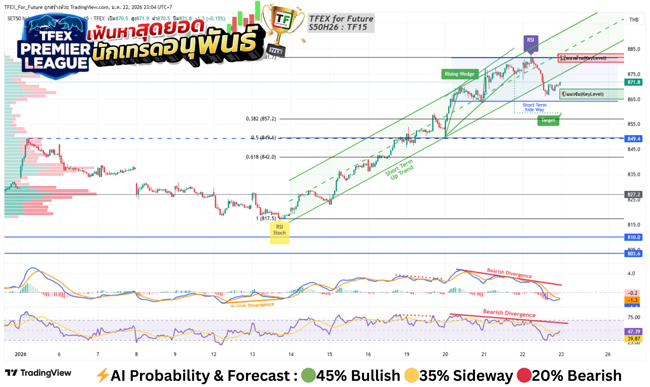 📉 Outlook&Tactical Plan : เทรนยังขึ้น(กรอบเขียว) แต่มีจุดต้องระวัง คือ หลุดแนวรับกรอบล่าง 870 + สัญญาณ Bearish Divergence ยังทำงาน วันนี้ถ้าจะคงขาขึ้นต่อ ต้องไปหลุด Low เดิม 867 ถ้าหลุด เป้าหมายล่าง 859.5