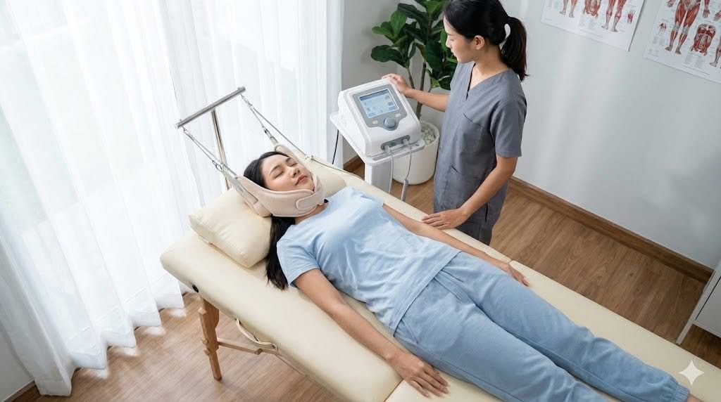### การดึงคอ (Traction) "ช่วยได้จริง" โดยเฉพาะในคนที่มีอาการปวดร้าวลงแขนจากกระดูกทับเส้นประสาท แต่... "ไม่ใช่ยาวิเศษที่ทำอย่างเดียวแล้วหายขาด"