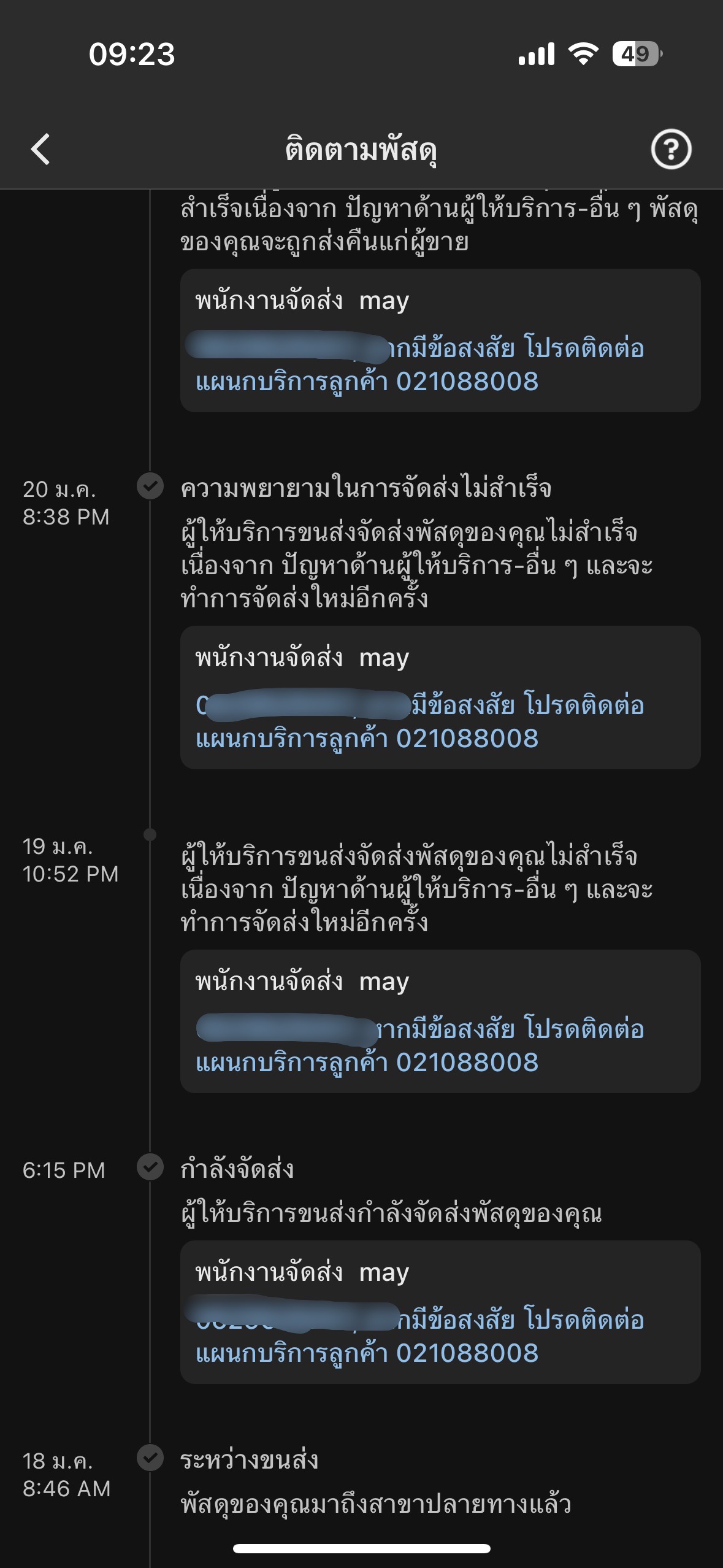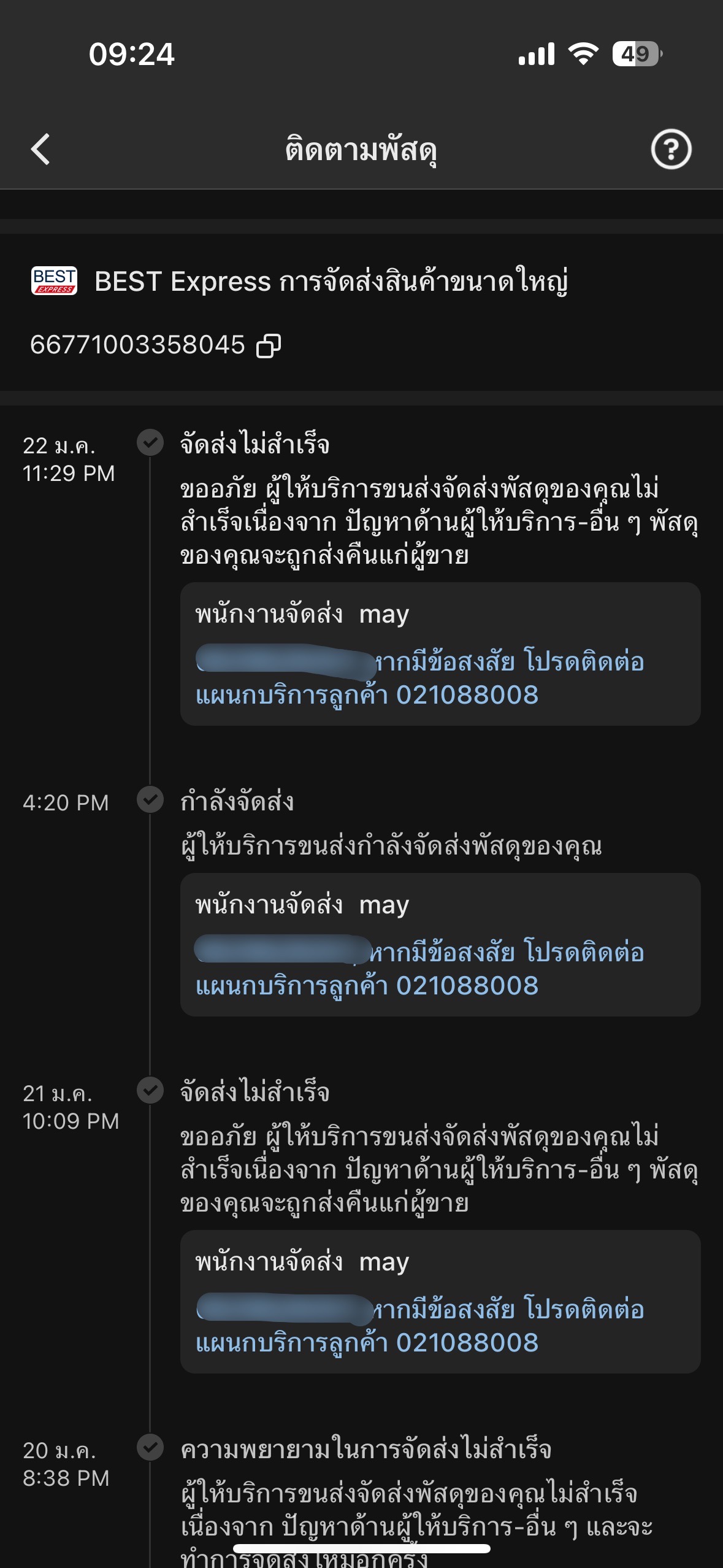 สวัสดีค่ะมีใครเคยได้รับพัสดุหรือใช้บริการขนส่งนี้ไหมคะเรื่องมีอยู่ว่าสั่งของในติ๊กต๊อกของเป็นของขนาดใหญ่วันที่18ของมาถึงสาขาปลายทางจนวันนี้ขึ้นแบบนี้เลยค่ะหาว่าส่งไม่สำเร็จทั้งๆที่หนูไม่ได้ปฏิเสธเลยค่ะไม่มีคนโทรเข้ามาด้วยซ้ำละโทรหาเบอร์ที่ขึ้นในระบบปรากฏว่าไม่มีคนรับสายฝากข้อความ2วันติดรู้สึกแย่มากเลยค่ะแถมชำระเฃินไปแล้ว800กว่าบาทกว่าจะรอตีกลับละได้เงินคืนใครมีประสบการณ์สามารถมาแชร์กันได้นะคะ