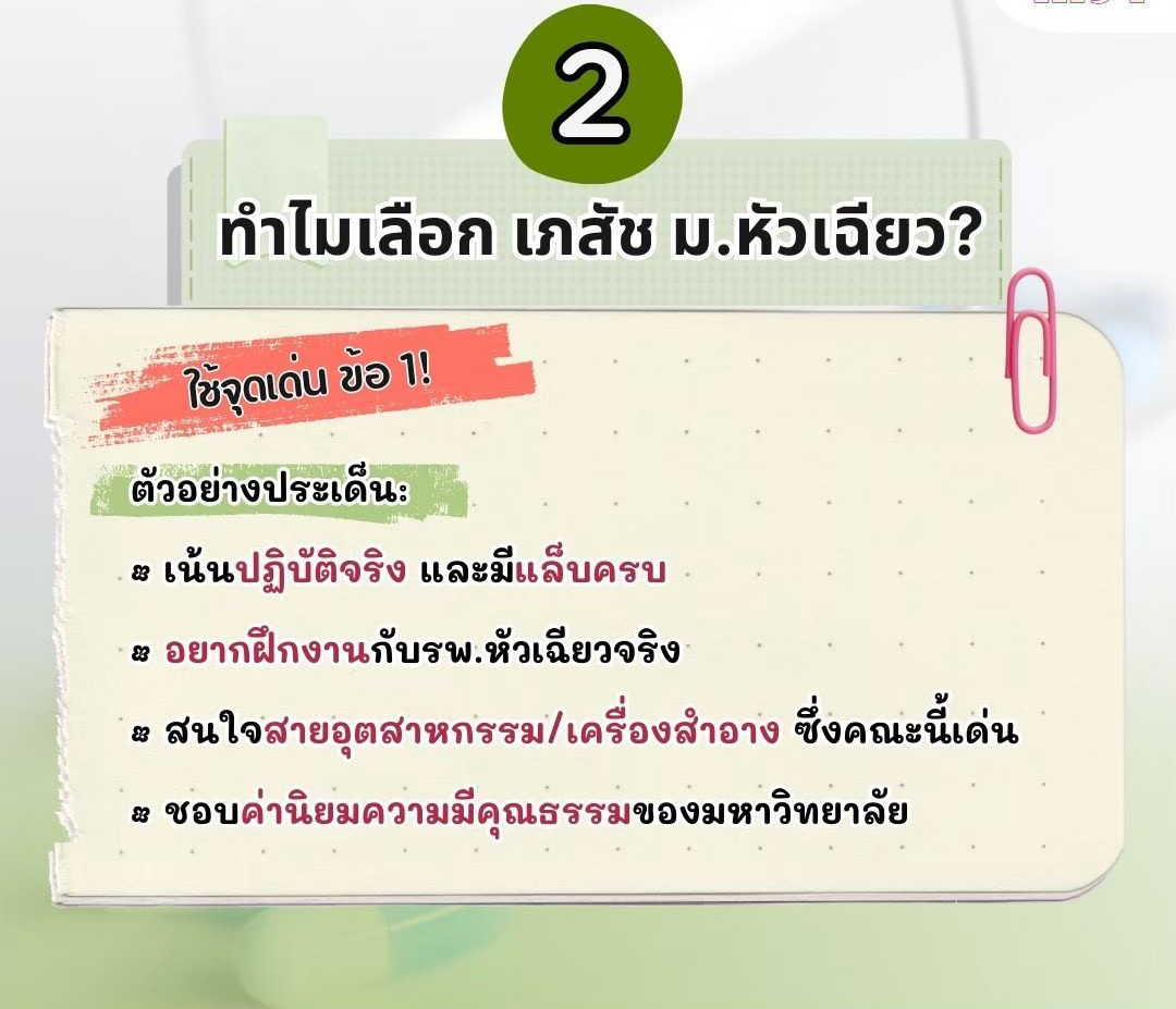 โชว์ความทำการบ้านมา เน้นเรื่อง Lab ที่ครบครัน โอกาสฝึกงานในโรงพยาบาลหัวเฉียว หรือความเชี่ยวชาญด้านเครื่องสำอางซึ่งเป็นจุดเด่นของที่นี่