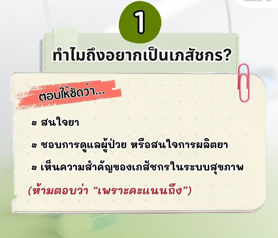 ต้องตอบให้เห็น Passion เช่น รักในการดูแลผู้ป่วย สนใจกลไกของยา หรือเห็นความสำคัญของเภสัชกรในระบบสาธารณสุข