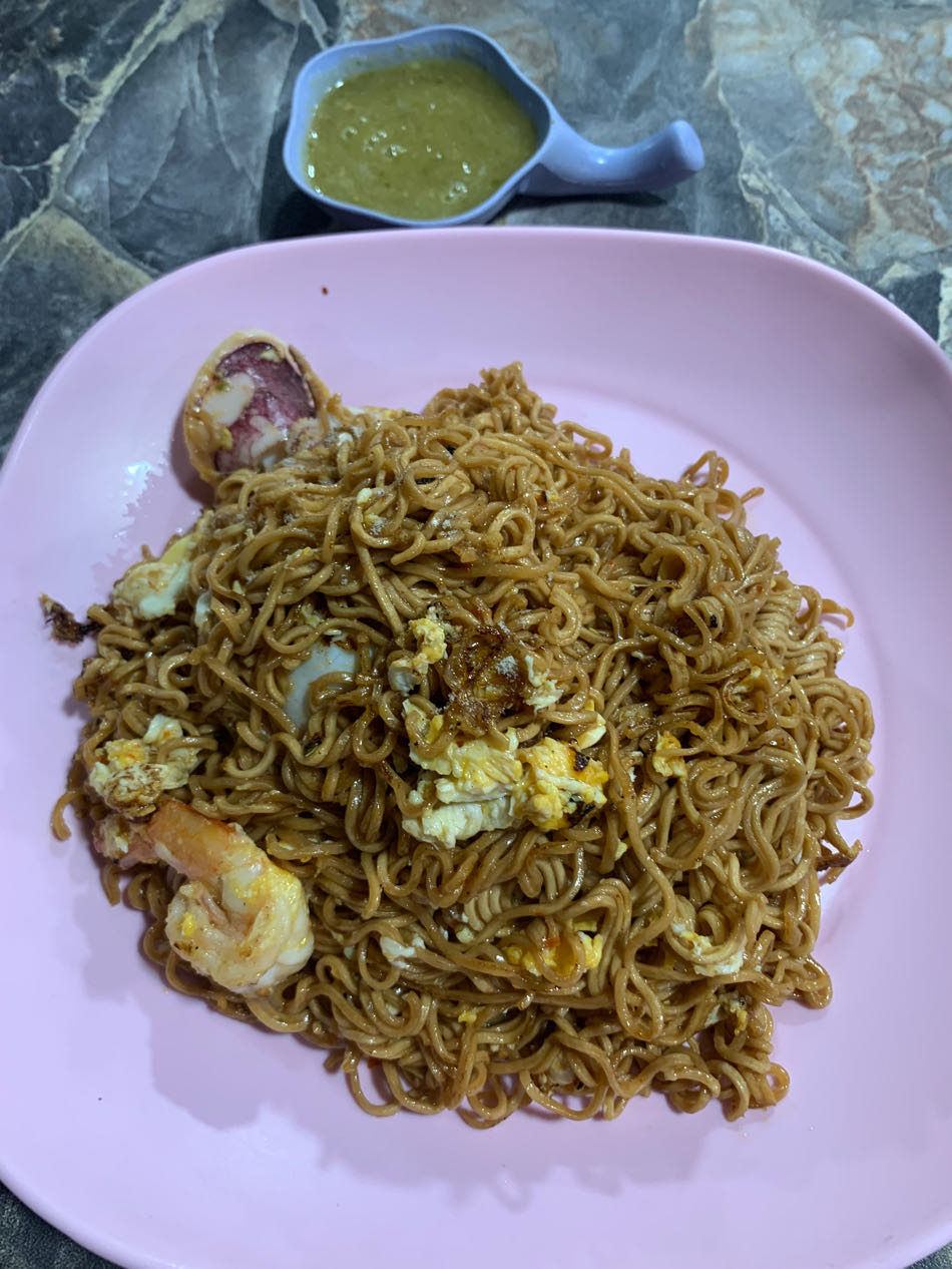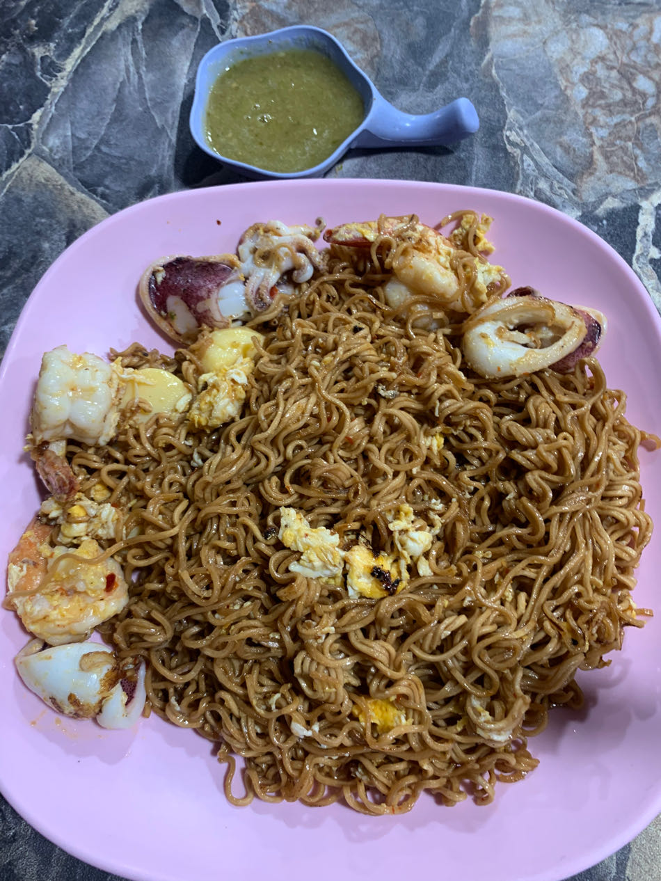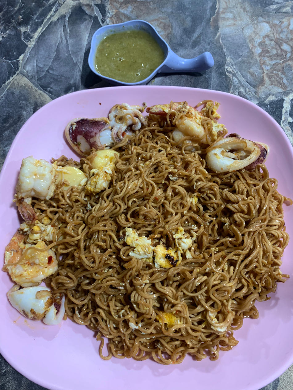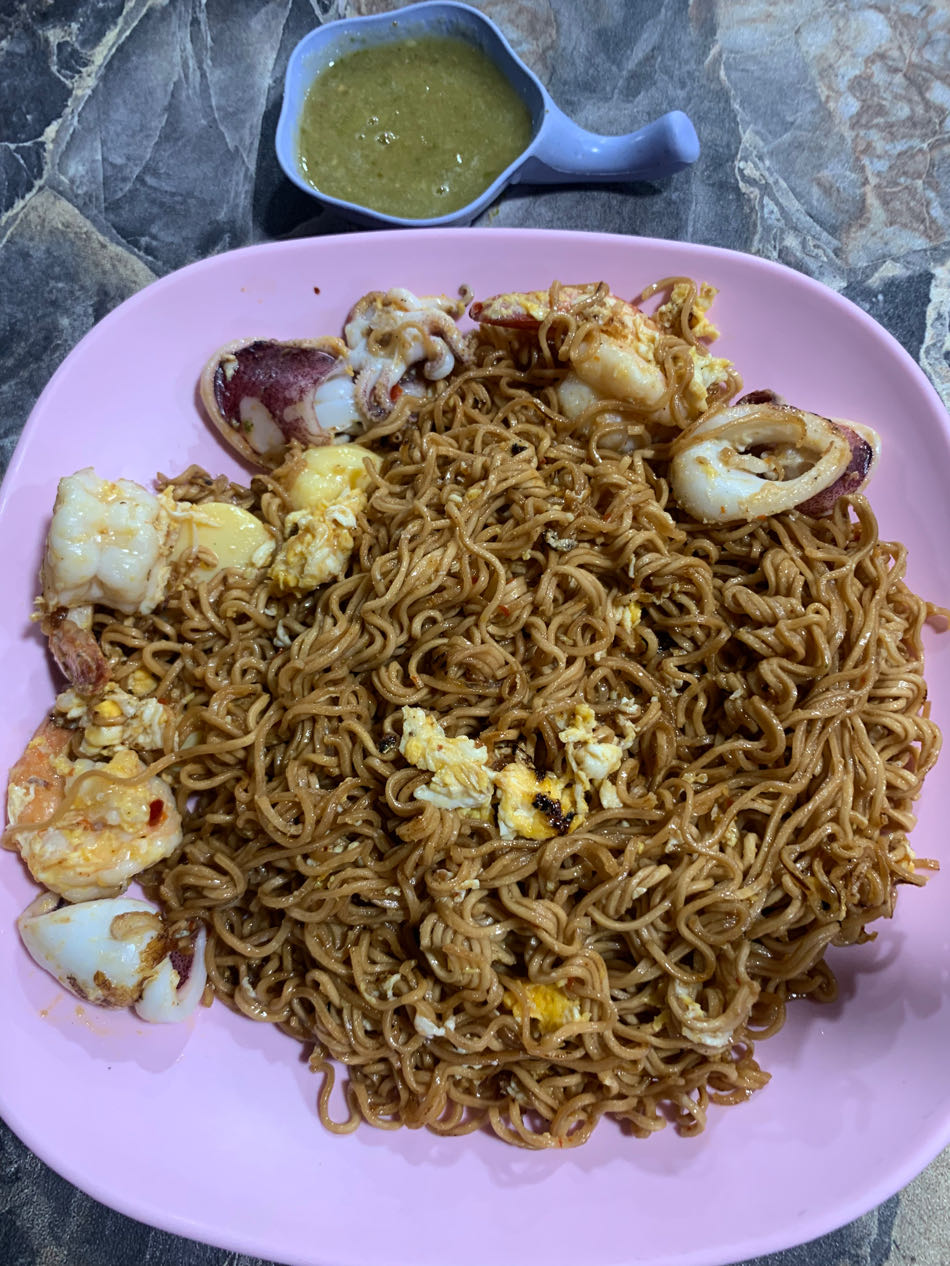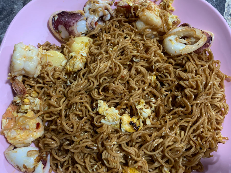บะหมี่ซองผัดสุกี้แห้งกุ้งหมึกใส่ไข่ใส่เต้าหู้ไข่ น้ำจิ้มซีฟู๊ด