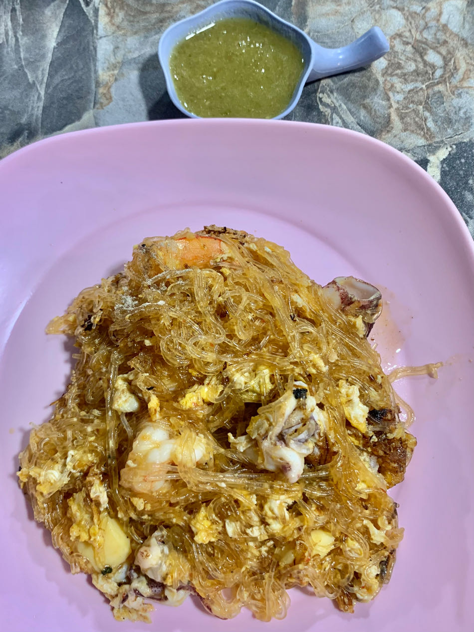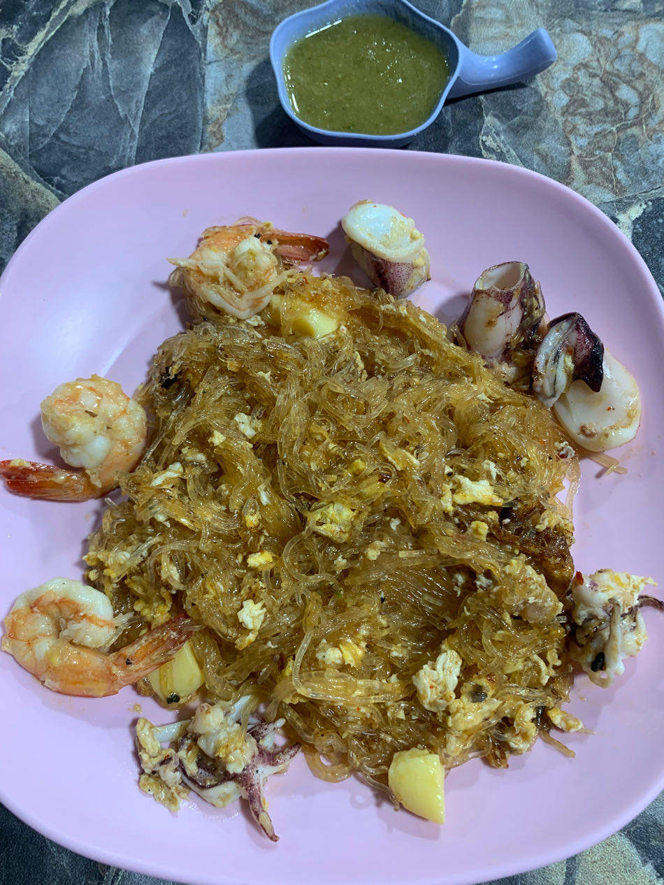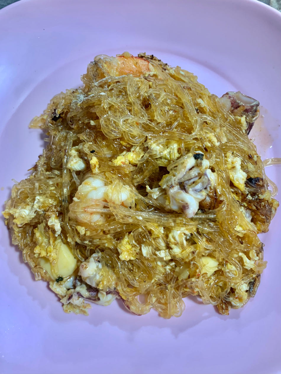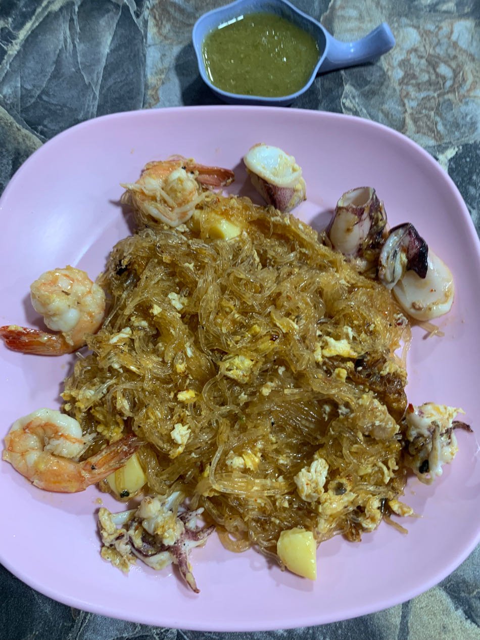 วุ้นเส้นผัดสุกี้แห้งกุ้งหมึกใส่ไข่ใส่เต้าหู้ไข่ น้ำจิ้มซีฟู๊ด