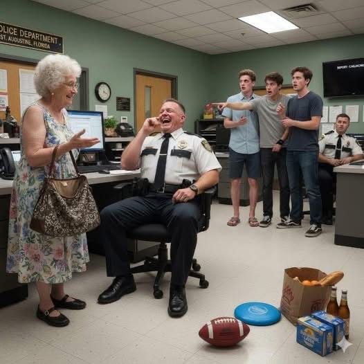 เมื่อเธอเล่าเรื่องจบ จ่าสิบตำรวจที่โต๊ะก็หัวเราะออกมา จากนั้นเขาก็ชี้ไปอีกด้านหนึ่งของห้อง ซึ่งมีชายหนุ่มหน้าซีดสามคนกำลังเล่าอย่างตระหนกว่าพวกเขาถูกปล้นรถโดย “หญิงชราสติไม่ดี ผมหยิกสีขาว สวมแว่นตา สูงไม่ถึงห้าฟุต และพกปืน”