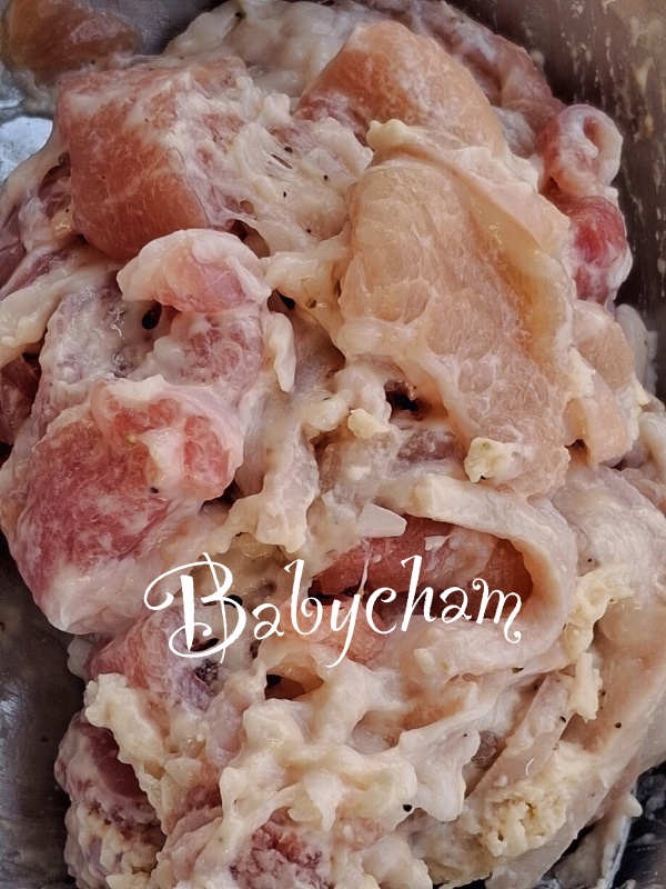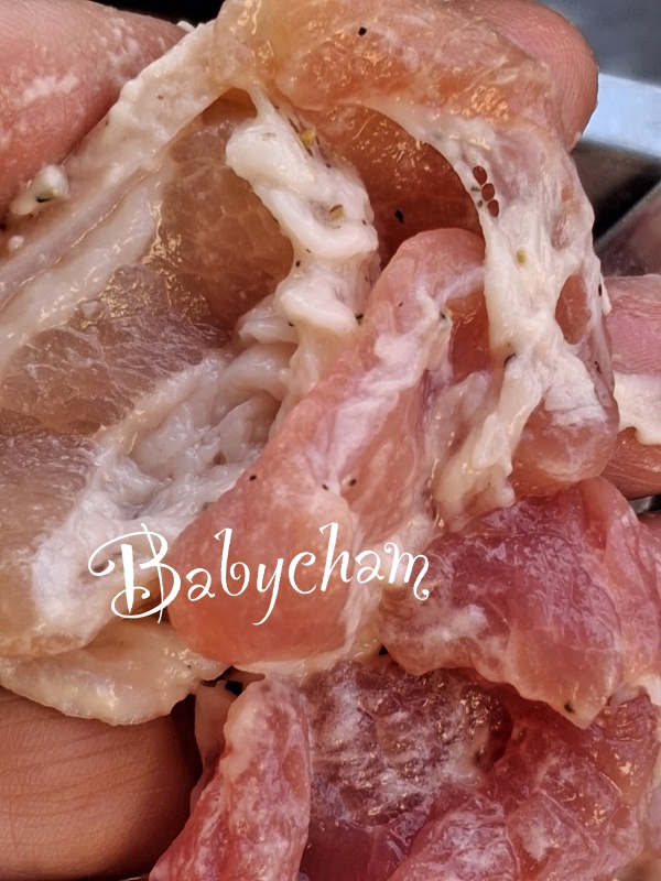 แม่เปป ลืมถ่ายภาพหมูสามชั้นสไลด์ที่ซื้อมา นึกได้อีกทีก็ผสมเครื่องหมักไปแล้ว เลยถ่ายมาได้แบบนี้ค่ะ เขาสวยจริงๆไม่จกตา หนังบาง มันน้อย เนื้อแน่นๆ