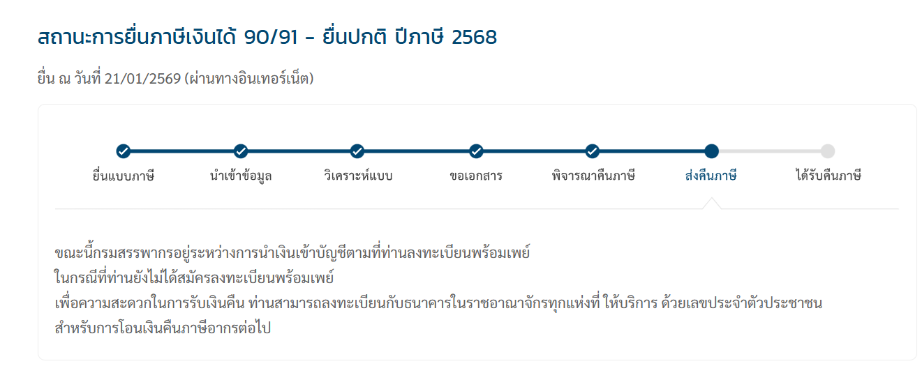 ยืนภาษีไปเมื่อ 14 มค 69 ด้วยข้อมูลที่ขึ้นการลดหย่อนภาษีที่ขึ้นในระบบ วันนี้ 23 มค 69 ยังคงขึอนสถานะ วิเคราะห์แบบ อยากทราบว่าใช้เวลาในการดำเนินคืนภาษีนานไหมครับ ปีที่แล้วยื่นถ้าจำไม่ผิดได้คืนไม่เกิน 1