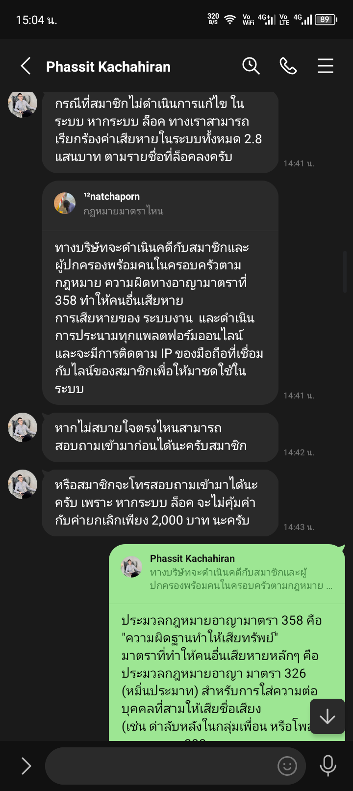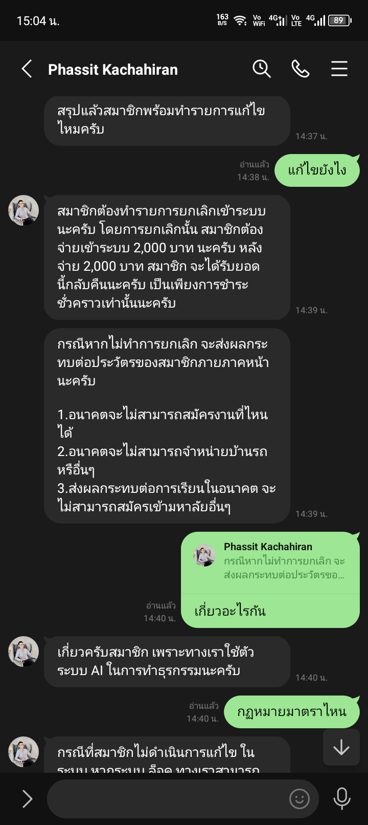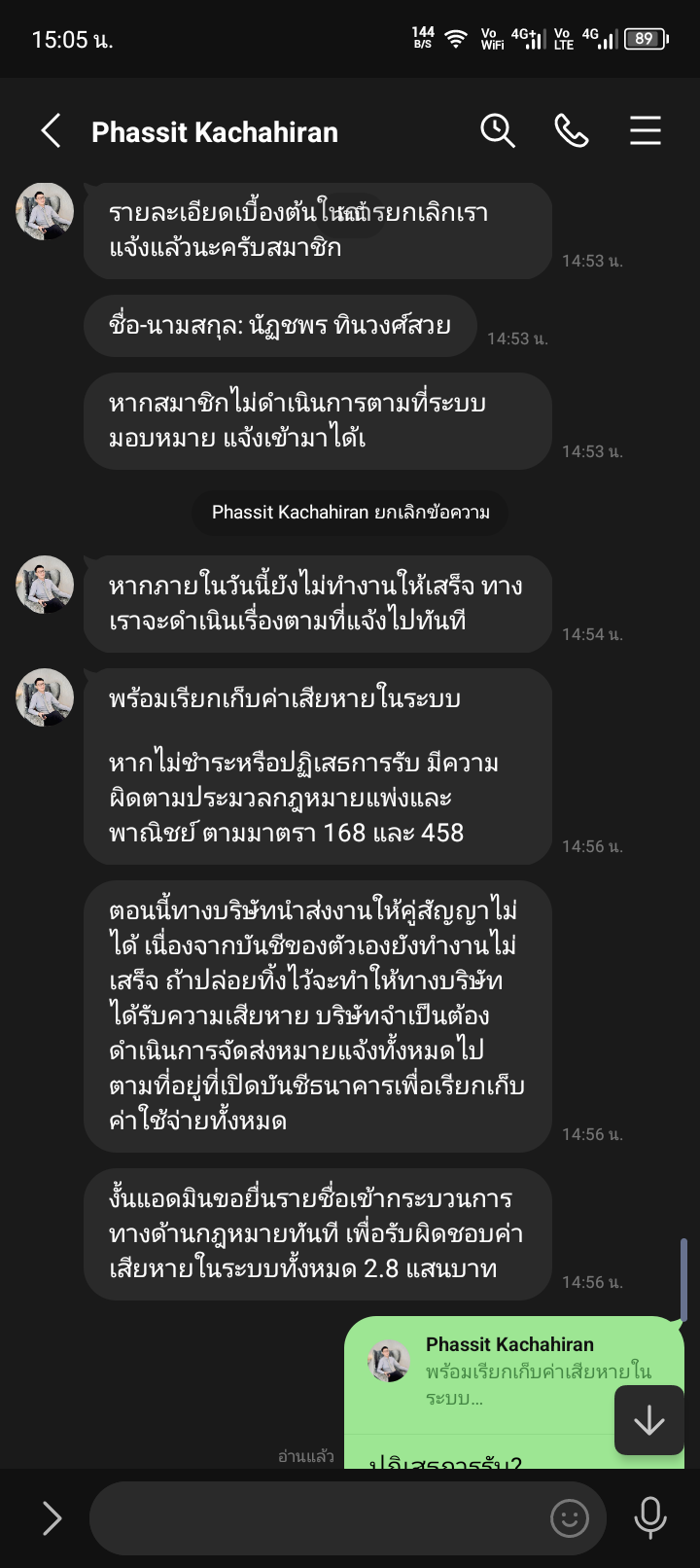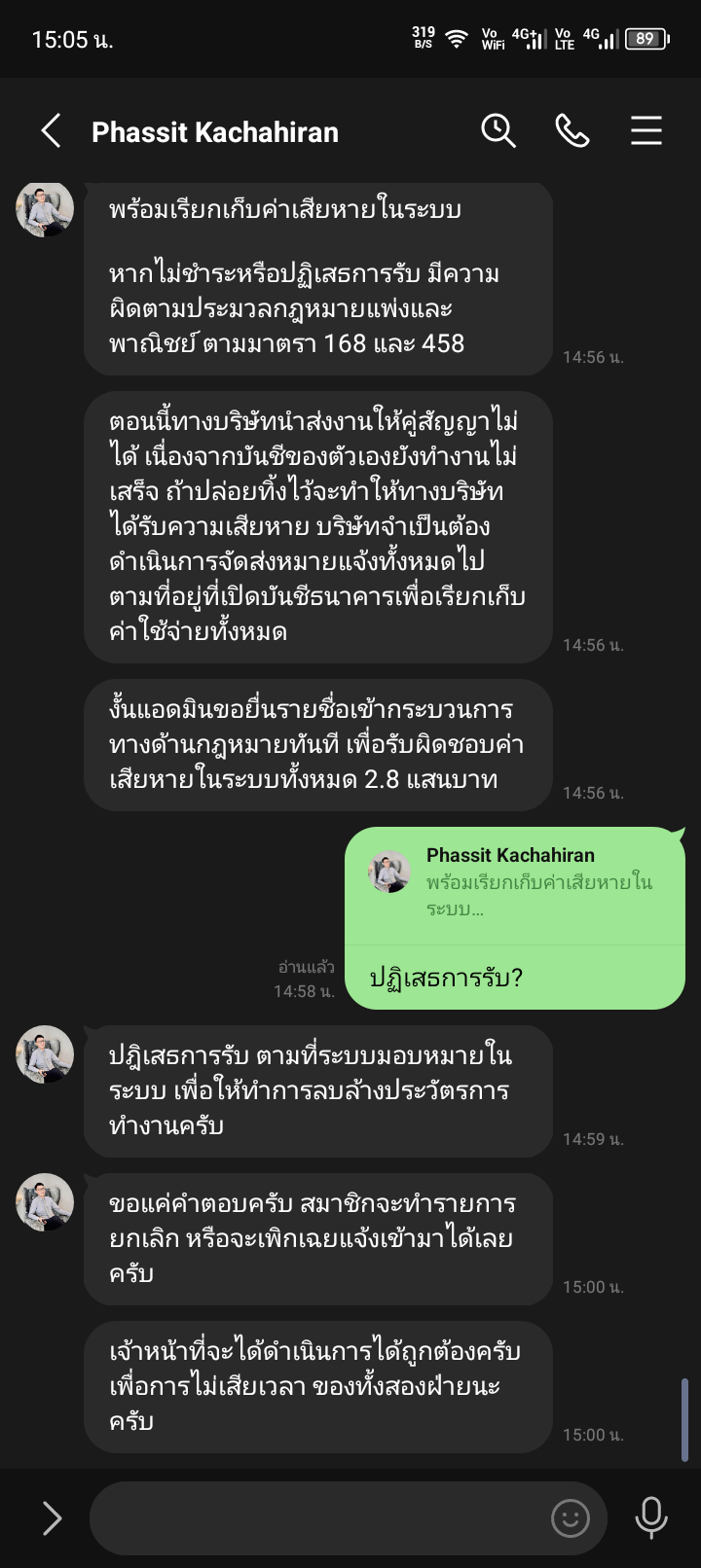 เงินยังไม่เข้าคือเราหางานออนไลน์ทำแล้วไปเจองานนึงมันให้ดูคลิปตต.คลิปล่ะ40บาทเราก็หลงเชื่อคิดว่าจะได้จริงเราก็เลยสมัครไปใส่บ้านเลขที่ใส่อะไรไปเสร็จปุ๊ปมันบอกให้เราโอนค่าประกัน100เราก็เลยโอนไป โอนเสร็จปุ๊ปมันบอกงานดูคลิปเต็มจะหางานใหม่ให้ คือกดลดราคาสินค้าเราก็เลย ทำมัน ให้ เรา กด 10ออเดอร์รวมเป็นเงิน114บาท กดเสร็จมันบอกว่าให้กดเราก็กดถอนเงินออกมาเข้าบัญชีผ่านไปซักพักเงินไม่เข้าบัญชีเลย ถามว่า ทำไมเงิน ไม่เข้า บัญชี มันบอก ว่า เราต้อง โอน เงิน ทุน รอบที่ 2ให้เงิน ถึง จะ เข้า บัญชี แล้วเรา แบบ ไม่อยาก ทำแล้ว ไม่เอา แล้ว มันก็ ขู่ เรา บอกว่า จะ แจ้งความ ฟ้อง คดี เรา เรากลัวมากก็เลยบล็อกไปพอบล็อกได้ไม่นานก็มีคนใน รูป ทักมา ทักมา สองวัน วันแรก เรา ไม่ได้ สนใจ แล้ว เหมือน จะ ออกจากระบบแล้ว เข้าบัญชีใหม่ทักมาขู่เราใหม่แบบในรูปคือตอนนี้เรากลัวมากไม่รู้จะทำไง เราลองเอา มาตราไปค้นดูในกูเกิ้ลมันไม่ตรงกะที่มันขู่เรานะ