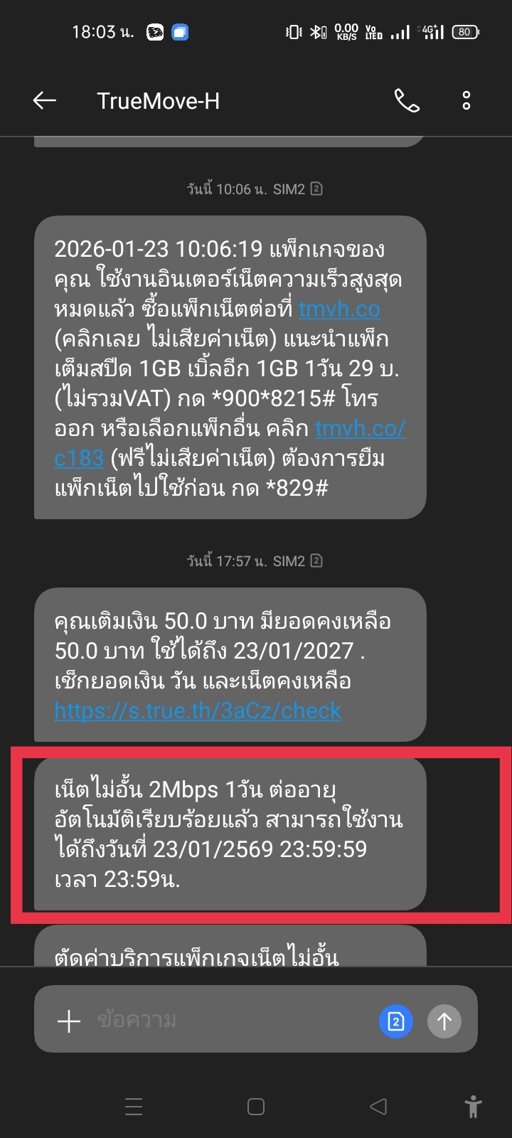 ข้อความเข้าว่ามีแพ็คเกจเน็ตและโทรฟรีทุกเครือข่าย 1 วัน แต่เวลาโทรโดนหาเงินจนหมดและครั้งต่อไปก็โทรไม่ได้อีก ข้อความตามรูปเลยค่ะ