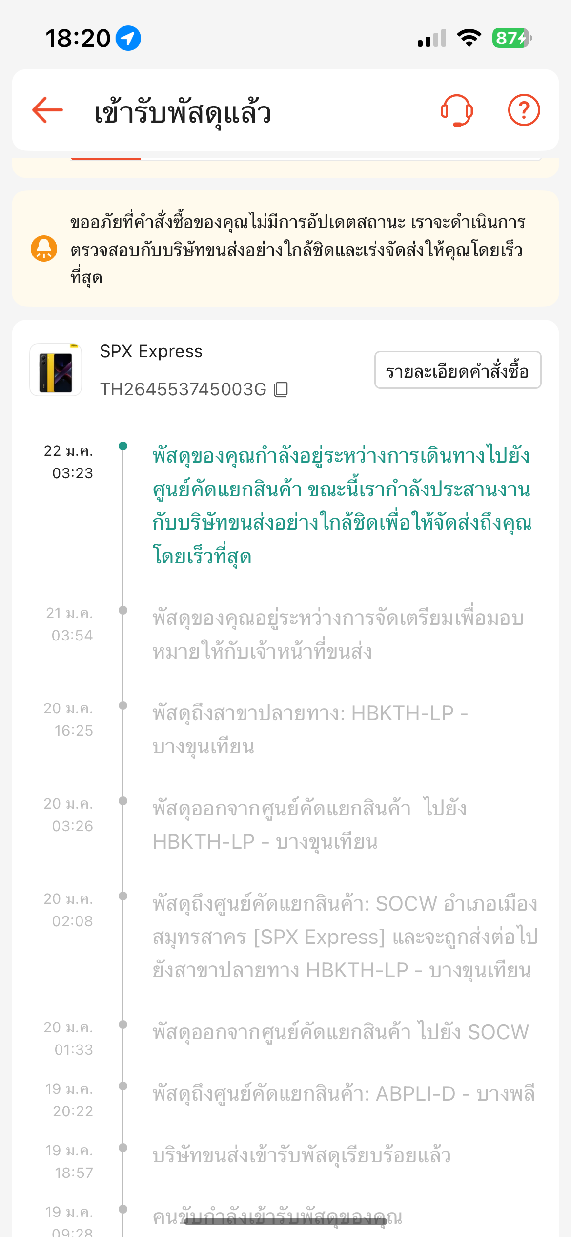 สั่งสินค้าแล้วได้ขนส่ง spx แล้วสถานะจนส่งรับพัสดุมาแล้ว แล้วค้างอยู่ตำแหน่งเดิทเป็นอาทิตย์ ส่งเมลล์แจ้งตรวจสอบไปก็เงียบหาย โทรไปก็มีแต่หัวข้ออะไรที่ๆม่เกี่ยวข้องกับการติดตามพัสดุจากขนส่ง และไม่ม
