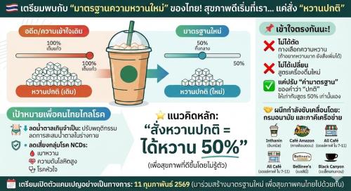 ดร.แพทย์หญิงสายพิณ โชติวิเชียร ผู้อำนวยการสำนักโภชนาการ กล่าวว่า กรมอนามัยจึงขอเชิญชวนประชาชนร่วมเปิดใจ ทดลอง และเลือกเครื่องดื่มที่หวานน้อยลง เพื่อสุขภาพที่ดีของตนเองและครอบครัว พร้อมเชิญชวนผู้ประกอบการร้านเครื่องดื่มชงทั่วประเทศเข้าร่วมเป็นภาคีเครือข่ายในการขับเคลื่อนมาตรฐานความหวานใหม่ และร่วมเป็นส่วนหนึ่งของการเปลี่ยนแปลงสุขภาพคนไทยอย่างยั่งยืน กรมอนามัยกับภาคีเครือข่ายมีแผนเปิดตัวแคมเปญ “หวานปกติ เท่ากับ หวาน 50%” อย่างเป็นทางการในวันที่ 11 กุมภาพันธ์ 2569 ซึ่งคาดว่าจะเป็นจุดเริ่มต้นของการขับเคลื่อนนโยบายด้านโภชนาการที่สำคัญในระดับประเทศ ขอให้ประชาชนติดตามรายละเอียดการดำเนินงาน และโปรโมชั่นดีๆจากแบรนด์เครื่องดื่มแต่ละแบรนด์ หวานปกติ…กำลังเปลี่ยนไป เพื่อสุขภาพที่ดีขึ้นของคนไทยทั้งประเทศ