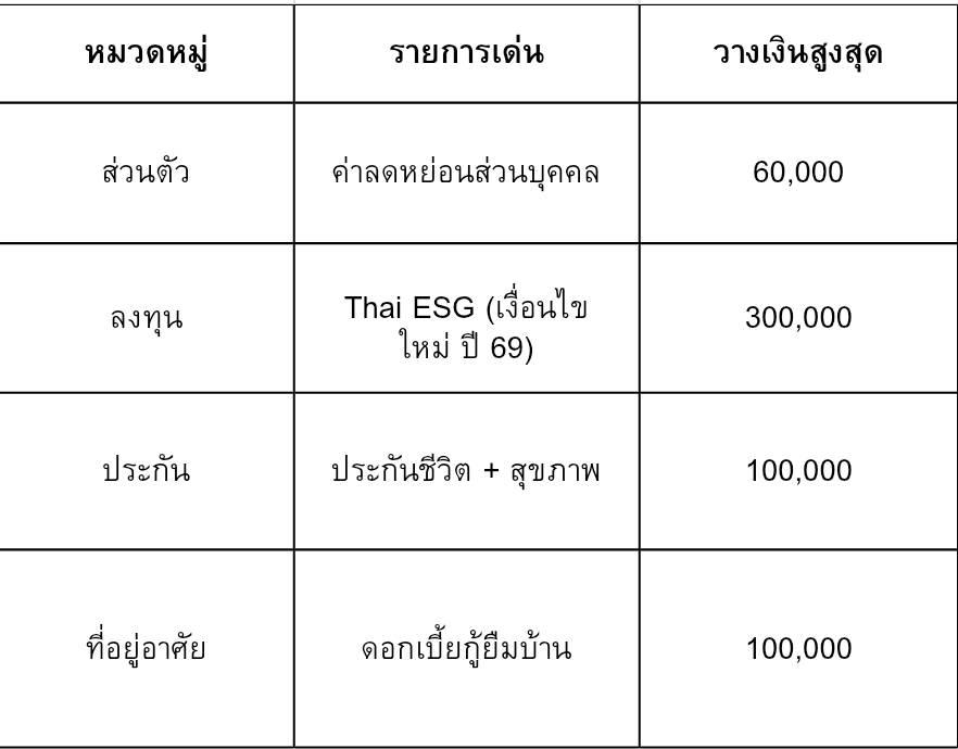 • Thai ESG (กองทุนไทยเพื่อความยั่งยืน): [Highlight ปี 2569] ลดหย่อนได้ 30% ของรายได้ สูงสุดไม่เกิน 300,000 บาท (ถือครอง 5 ปีเต็ม)
