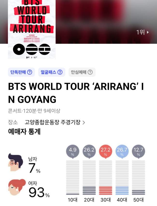 วง BTS จะจัดคอนเสิร์ต “BTS WORLD TOUR 'ARIRANG' IN GOYANG” ในวันที่ 9, 11 และ 12 เมษายน ณ สนามกีฬาหลักของสนามกีฬาโกยาง BigHit Music และ Nol Ticket ซึ่งเป็นผู้จัดจำหน่ายบัตรคอนเสิร์ต BTS อย่างเป็นทางการในเกาหลีใต้ ได้เปิดขายบัตรล่วงหน้าเฉพาะสมาชิก Weverse ภายในเวลาไม่กี่นาที จำนวนผู้ที่รอคิวซื้อบัตรก็ทะลุ 100,000 คน ต่อมา บัตรเข้าชมคอนเสิร์ตทั้งสามคืนที่สนามกีฬาโกยางในเดือนเมษายนนี้ขายหมดเกลี้ยง