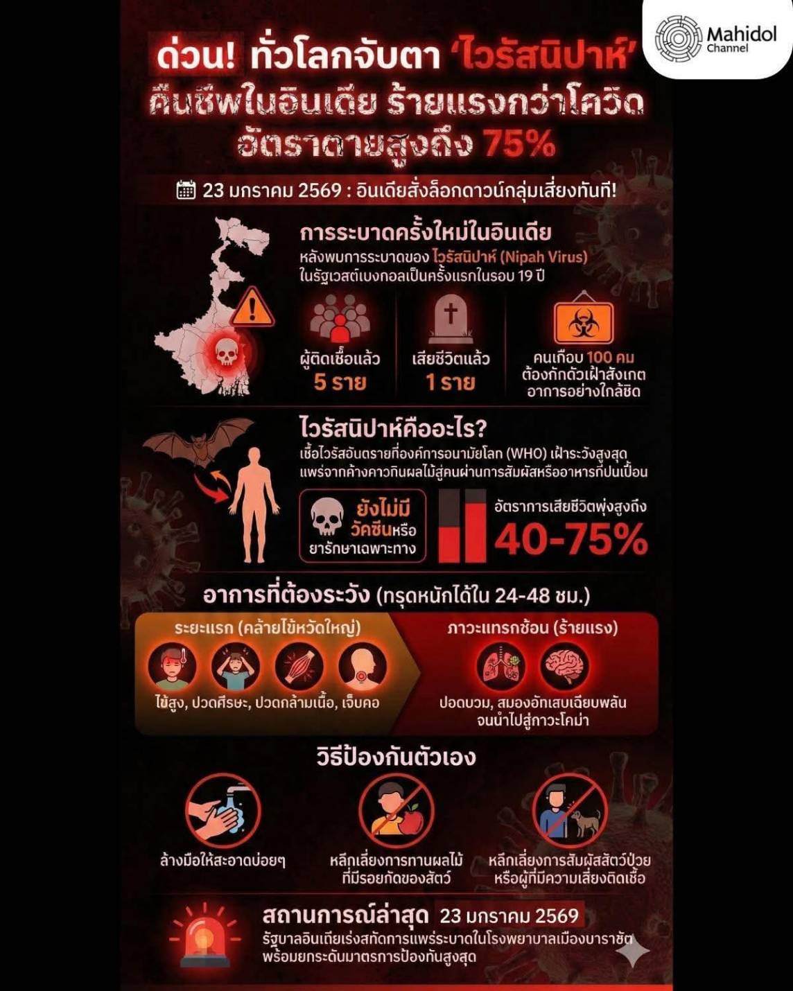 ไวรัสนิปาห์ระบาดหนักในเวสต์เบงกอล พบเชื้อจากค้างคาว ไร้วัคซีนรักษา พร้อมสั่งจับตาอาการคล้ายไข้หวัดใหญ่แต่ตายสูง เตือนอันตรายถึงขั้นสมองอักเสบ-โคม่า . 23 มกราคม - มีรายงานว่า รัฐบาลอินเดีย ประกาศกำลังเ