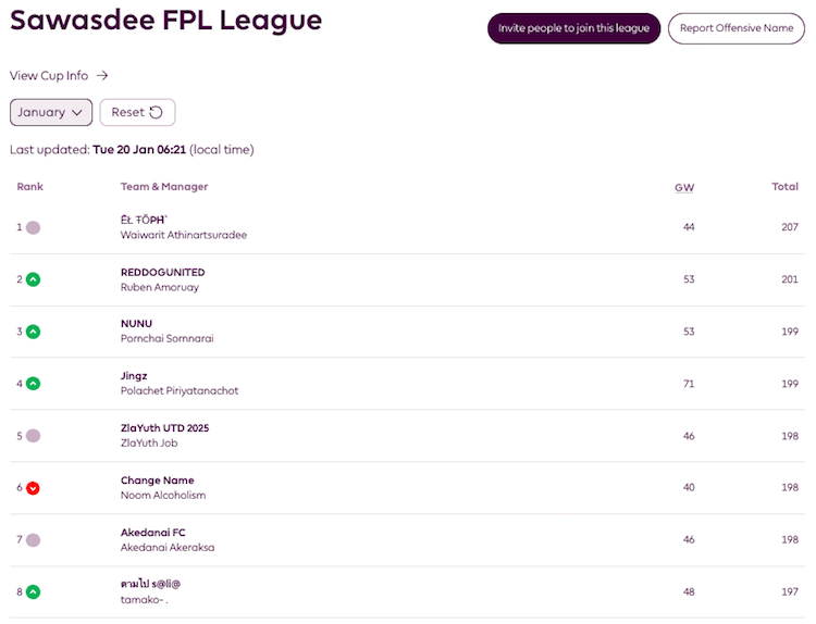 สรุปคะแนนเดือน ม.ค. ของ Sawasdee FPL League หลังจบ GW22