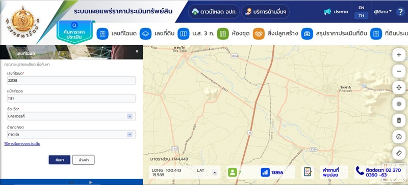 ใส่เลขที่โฉนด หน้าสำรวจ จากนั้นเลือกจังหวัดและอำเภอ จากนั้นจะปรากฏราคาประเมินที่ดินต่อตารางวามาให้