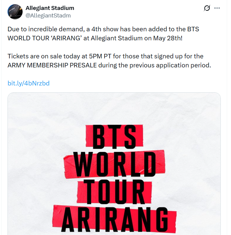 ✨BTS ประกาศเพิ่มรอบคอนเสิร์ตที่ Las Vegas ที่ Allegiant Stadium (จาก 3 เป็น 4 รอบ)