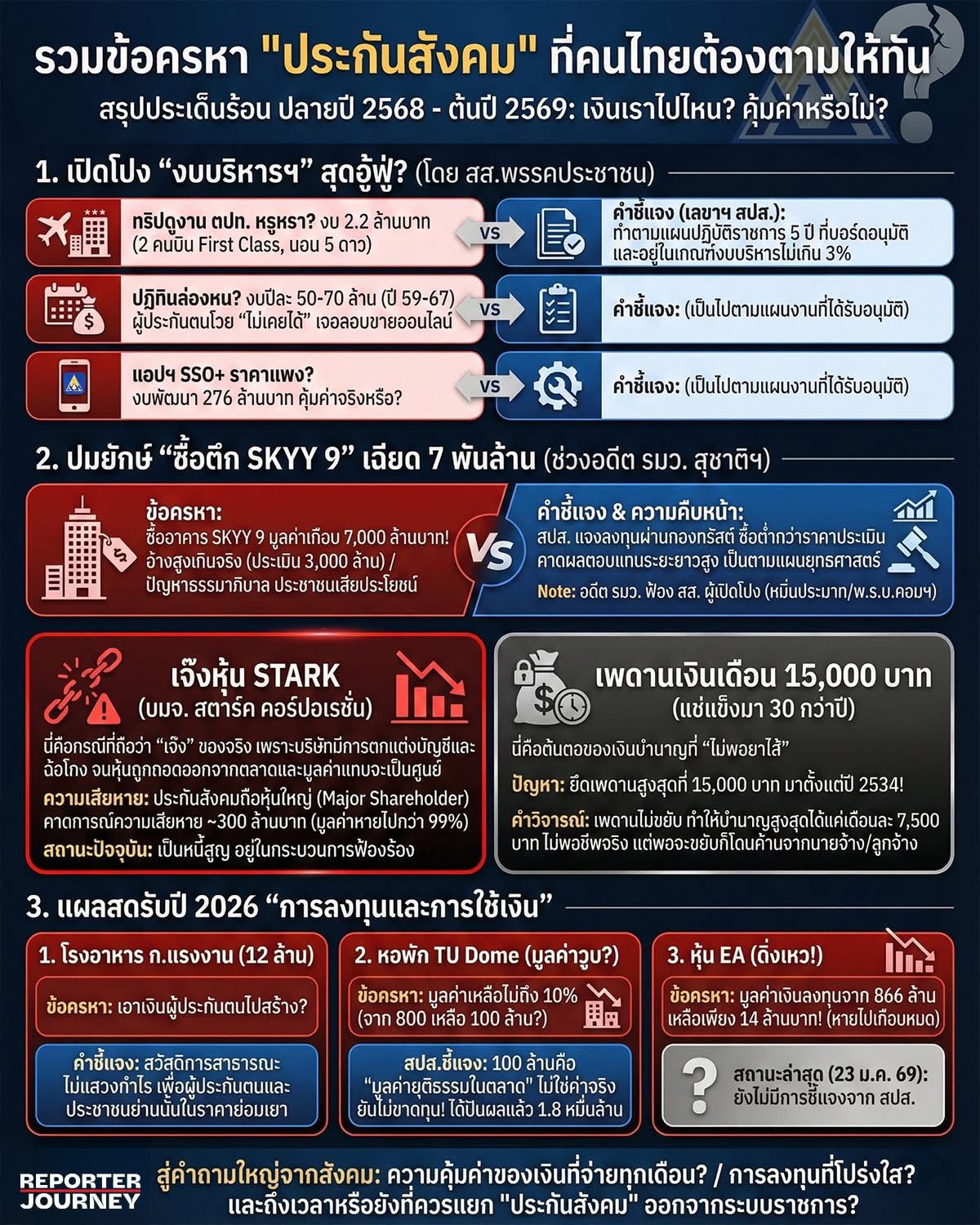 ในช่วงตั้งแต่ปี 2568 - 2569 หน่วยงานที่ขึ้นชื่อว่ามีประเด็นถูกวิพากษ์วิจารณ์มากที่สุดแข่งกับ สำนักงานตรวจเงินแผ่นดิน (สตง.) ก็คือ สำนักงานประกันสังคม เนื่องจากในแต่ละเหตุการณ์ที่ออกมาเป็นข่าว ต่างสร้างความคำถามตัวโตๆ กับสังคมคนทำงาน มนุษย์เงินเดือน และนายจ้างที่ต้องหักเงินเข้าประกันสังคมทุกเดือน เดือนละ 1,500 บาท รวมทั้งสิ้น 24 ล้านคนทั่วประเทศ เป็นเงินมหาศาลนับล้านล้านบาท หน่วยงานแห่งนี้เอาเงินของคนไทยวัยทำงานทั้งหลายไปทำอะไร ซึ่งหลายคนก็คงทราบข่าวเป็นระยะๆ แบบเป็นบางเป็น ตกหล่น บางประเด็นไปบ้าง เพราะประกันสังคมสร้างเรื่องเอาไว้เยอะเหลือเกิน