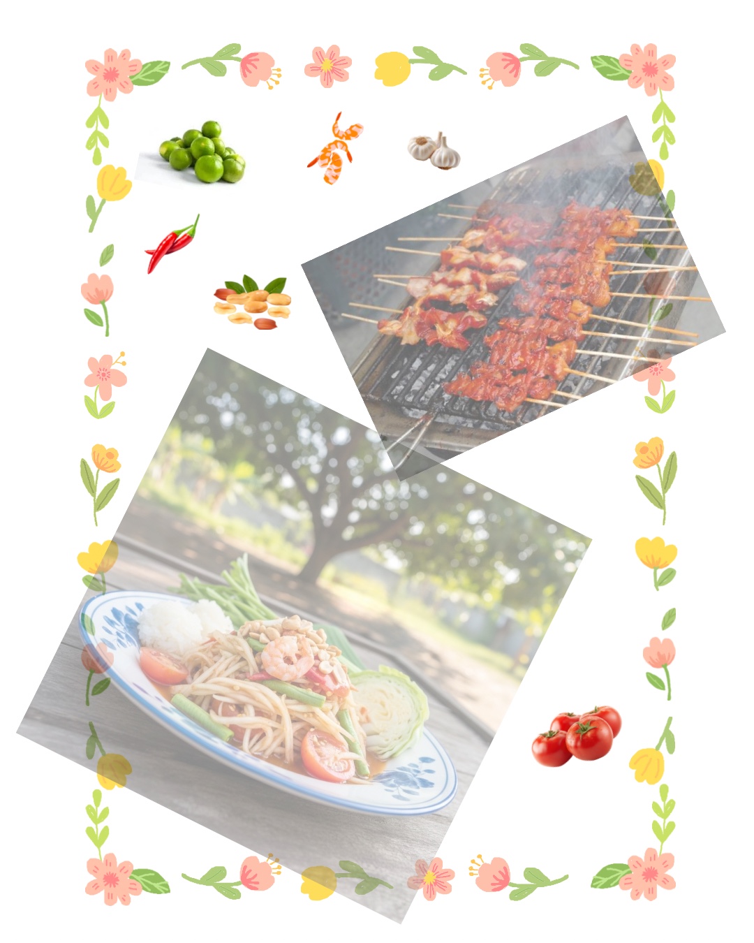กินกับข้าวเหนียวร้อน ๆ ไก่ย่างและหมูย่างสีแดง ๆ ซื้อจากรถเข็น ที่ควันโขมงผ่านหน้าบ้านทุกวัน วันนี้ฉันได้ลิ้มรสเจ้าไก่แดงบ้างล่ะ เพราะส่วนใหญ่ฉันทำได้แค่สูดกลิ่นควันหอม ๆ แล้วปล่อยให้ลอยจากไป…