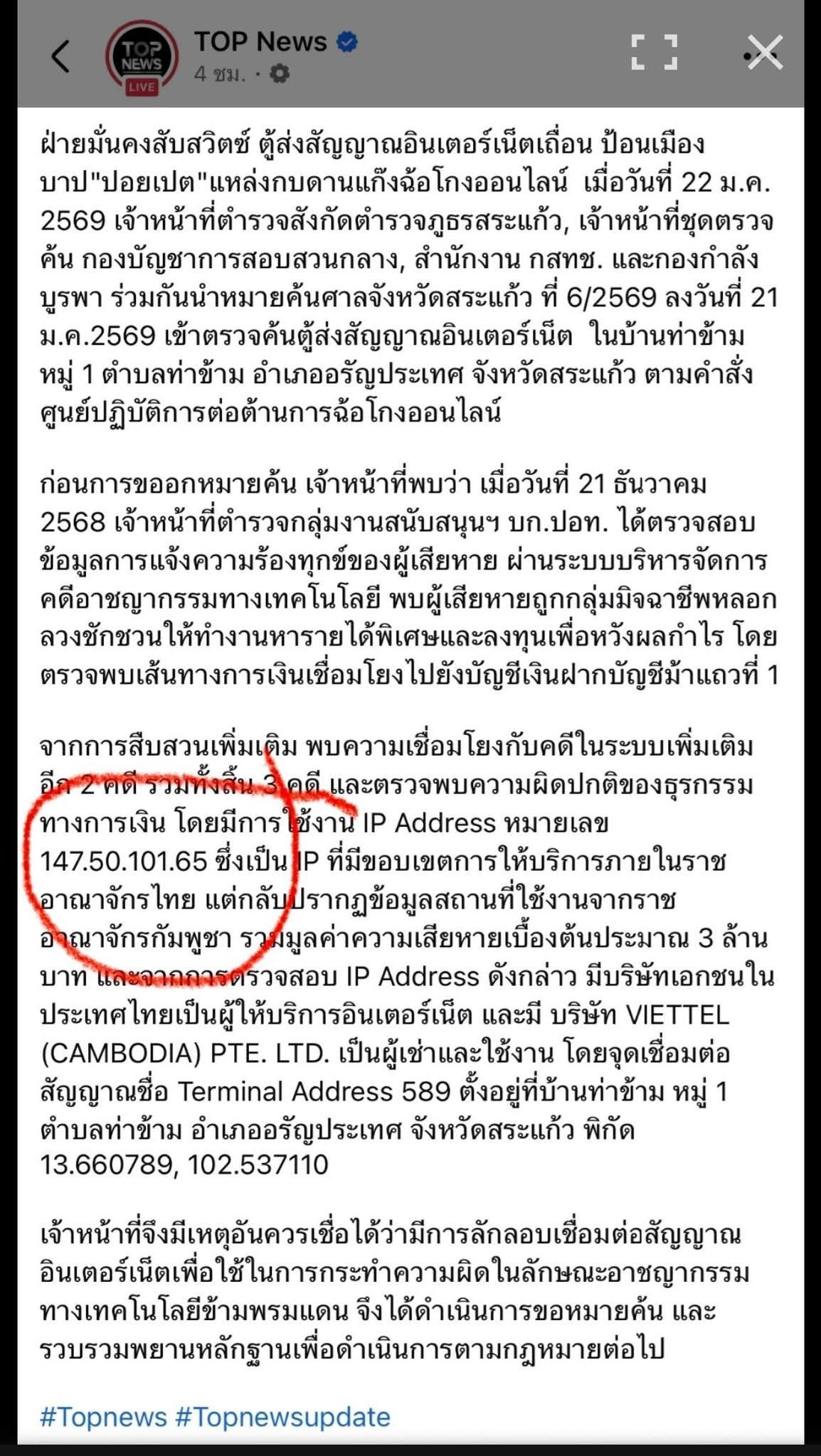 https://www.youtube.com/watch?v=gFPJBaRe9n4 เอไอเอส ชี้แจง! ปมข่าวตรวจพบบริษัทเอกชนลักลอบเชื่อมต่อสัญญาณ "อินเทอร์เน็ตข้ามประเทศ" ยืนยันทำงานร่วมกับตำรวจสอบสวนกลาง พบถูกลักลอบเชื่อมต่อออกไปย