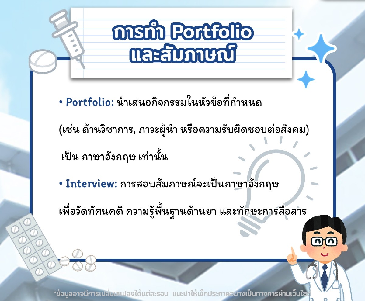 Portfolio: ต้องนำเสนอกิจกรรมโดดเด่น เช่น ด้านวิชาการ, ภาวะผู้นำ หรือความรับผิดชอบต่อสังคม และต้องจัดทำเป็น