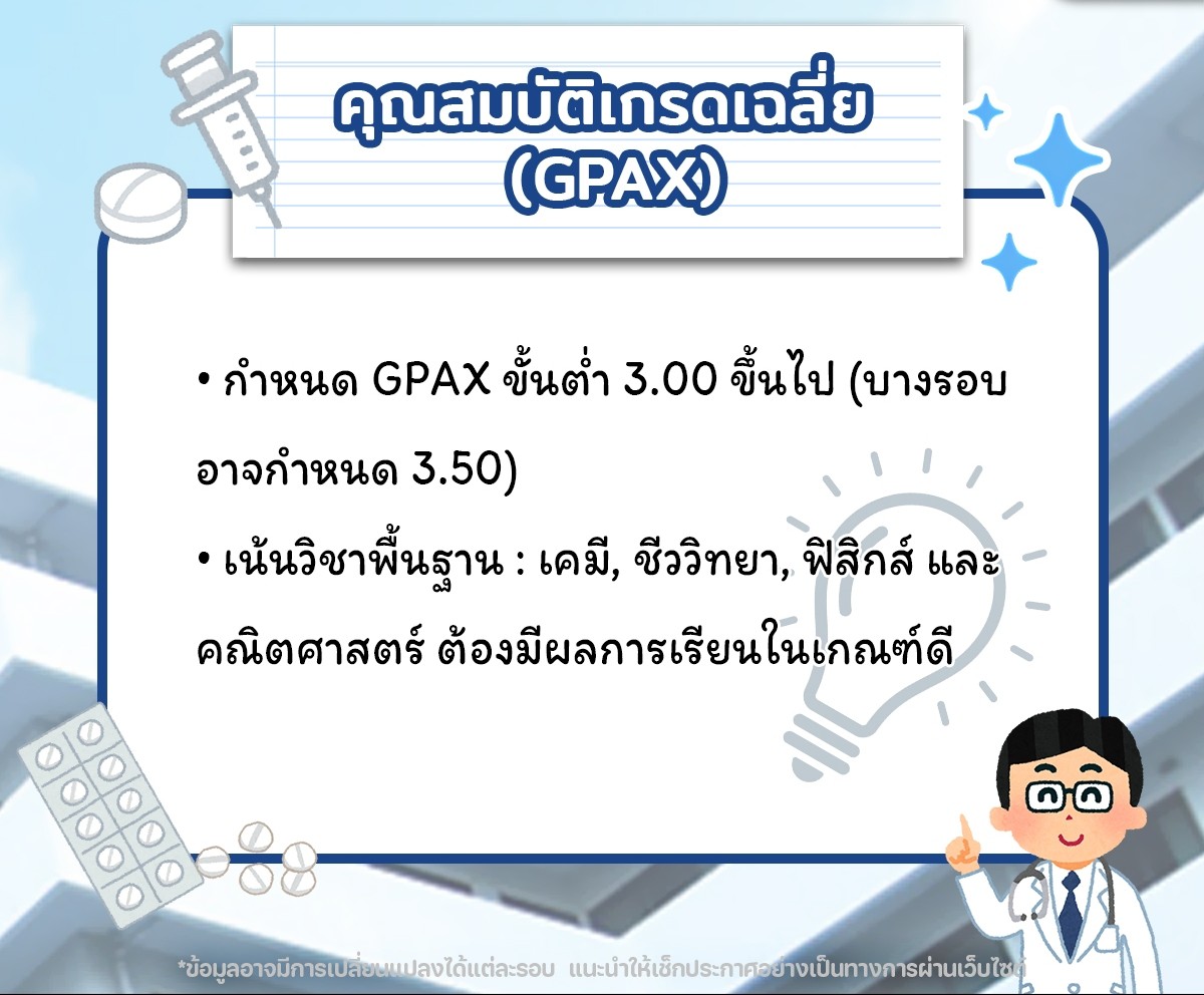 BMAT: ไม่กำหนดคะแนนขั้นต่ำ (หากมีคะแนนเดิมที่ยังไม่หมดอายุ 2 ปี สามารถนำมาใช้ได้)