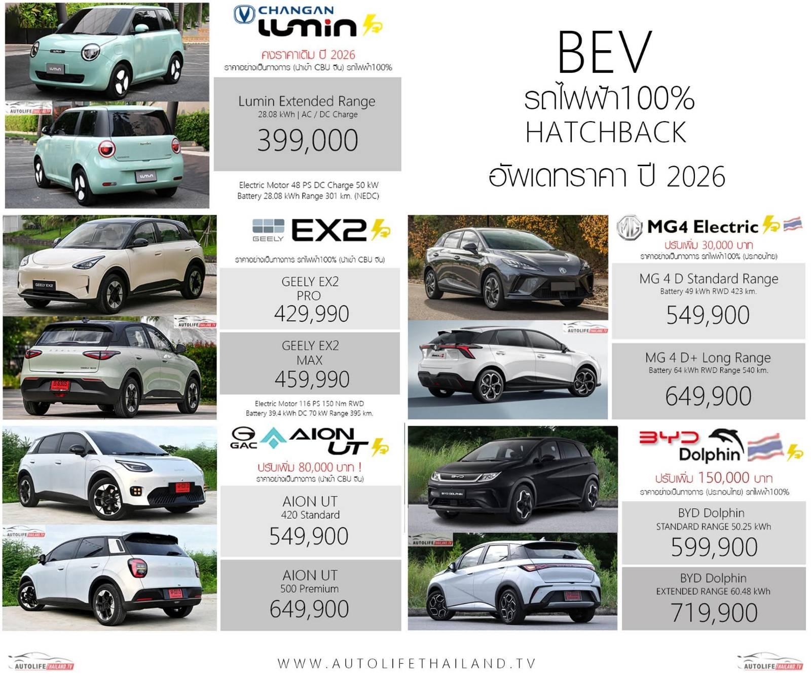 อัพเดทราคา ปี 2026 รถไฟฟ้า100% กลุ่ม HATCHBACK