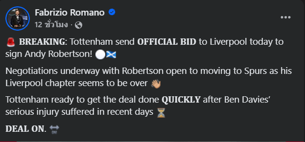 ข่าวจาก Fabrizio Romano Tottenham Hotspur สนใจดึงตัวโรเบิร์ตสัน
