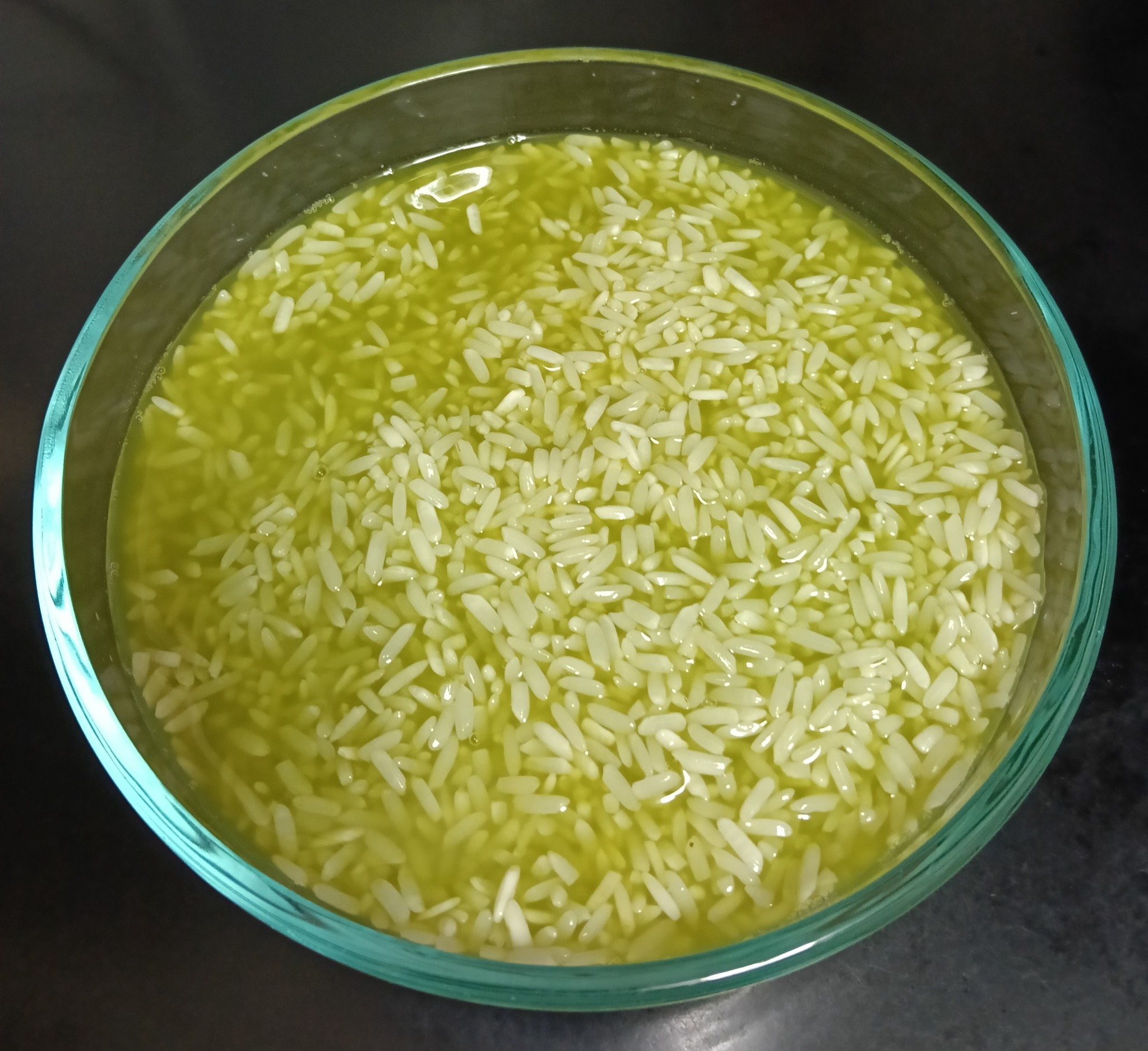 ล้างข้าวเหนียวให้สะอาดอย่างน้อย 2-3 น้ำ แล้วแช่ข้าวเหนียวด้วยน้ำสีเขียวๆนี้ไว้ข้ามคืน