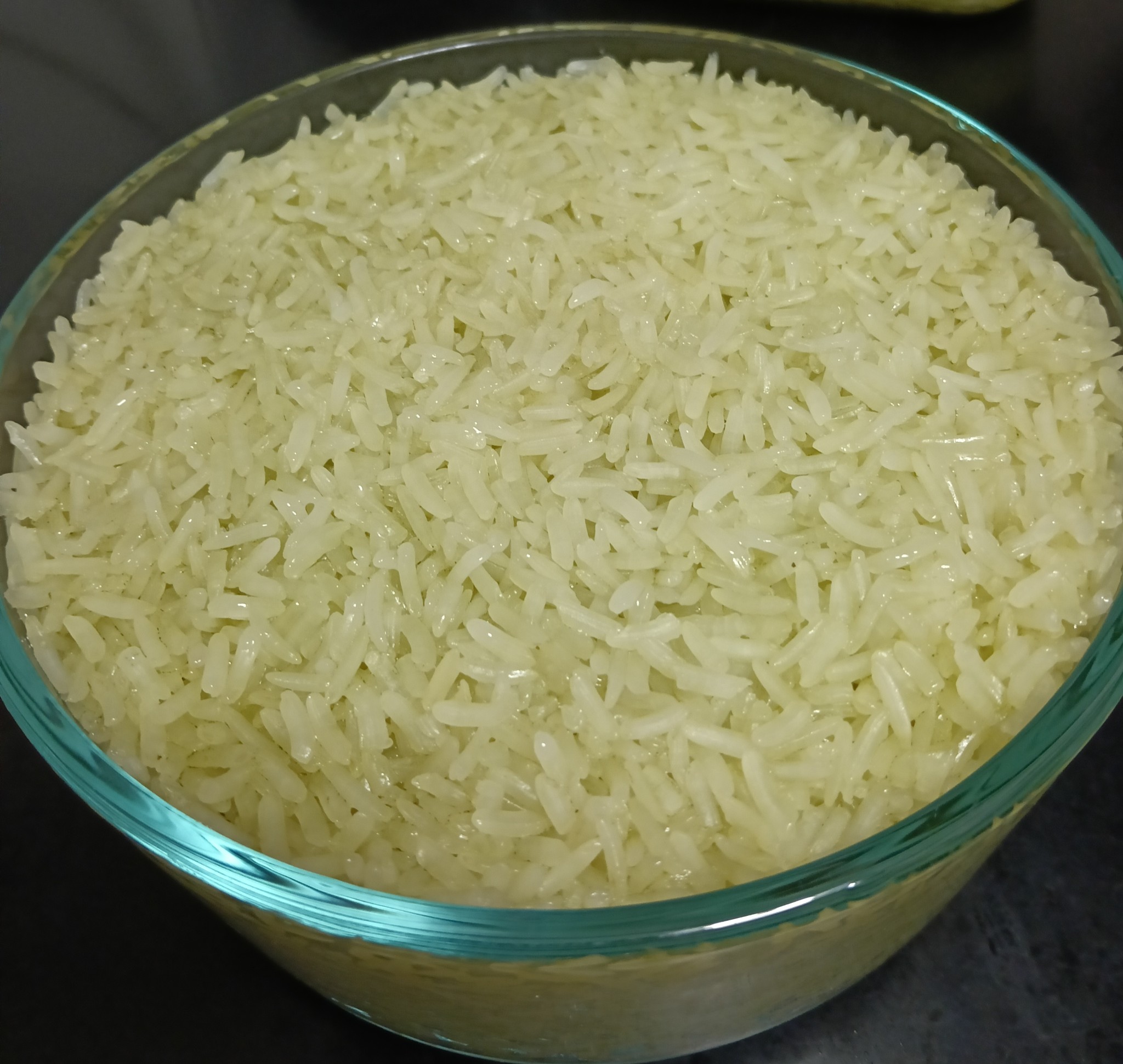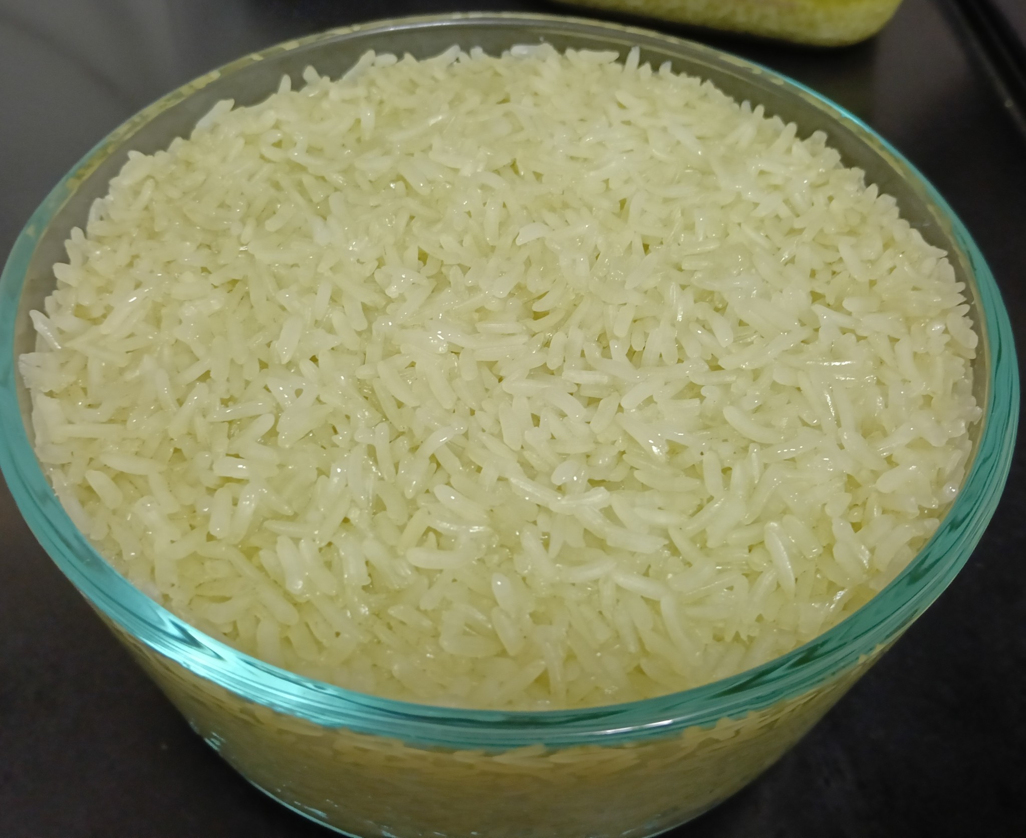 หลังจากนั้นก็ใส่น้ำลงไปให้ท่วมพอปริ่มๆ แล้วปิดฝา เอาเข้าไมโครเวฟ 7 นาที (ระยะเวลามากน้อย ขึ้นอยู่กับปริมาณข้าว และกำลังวัตต์ของไมโครเวฟ)