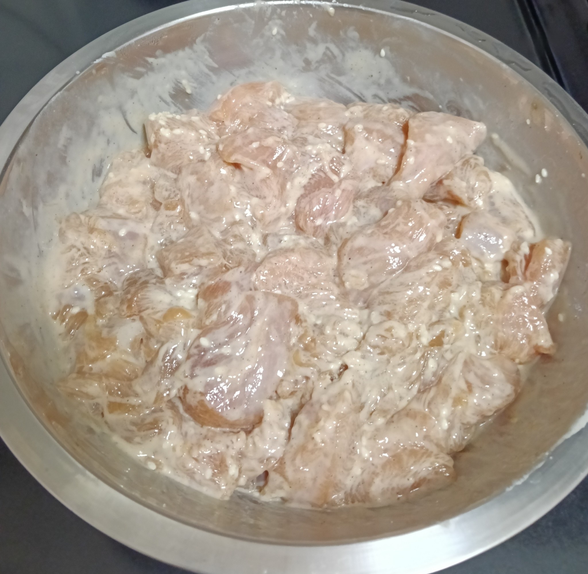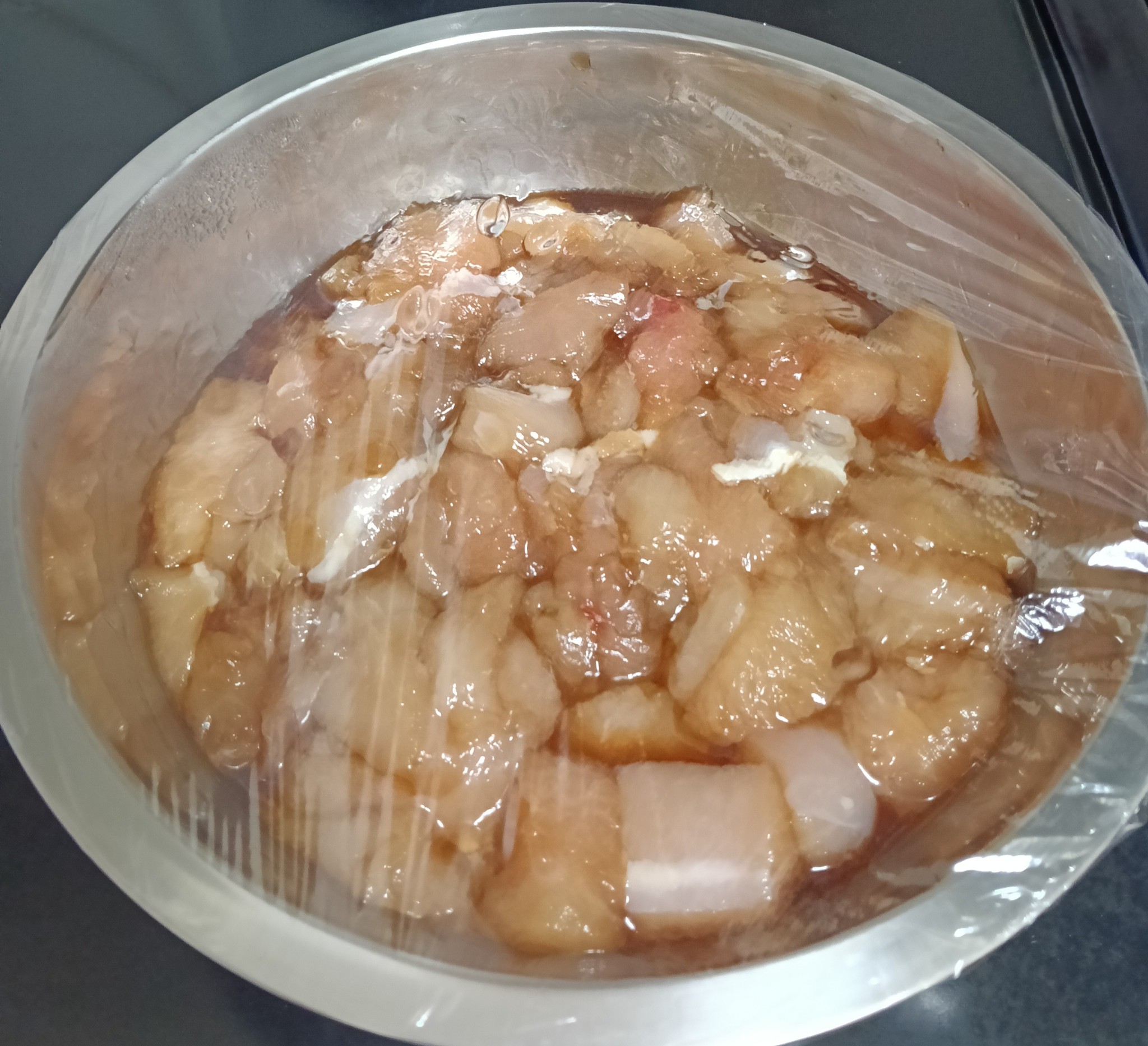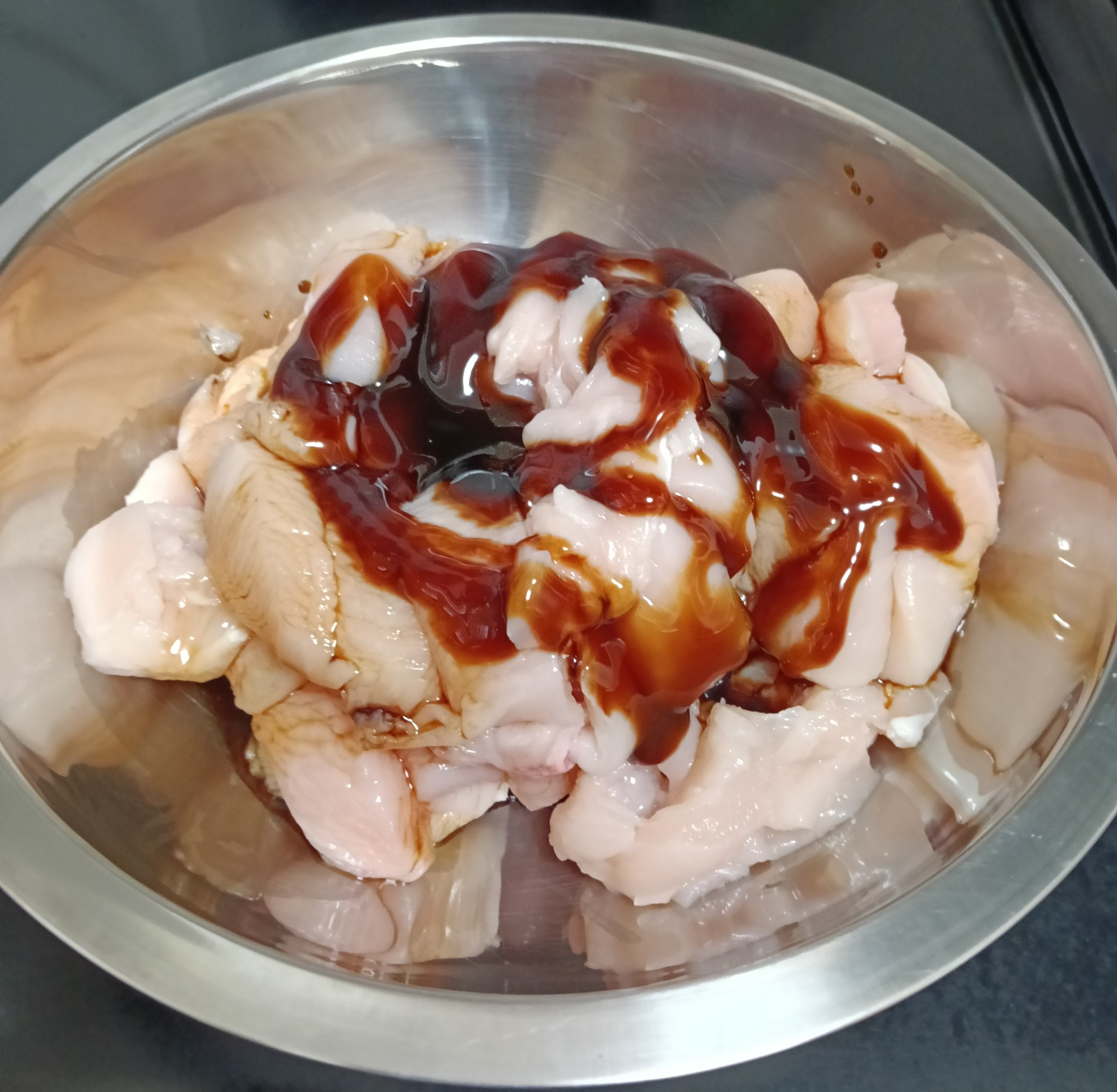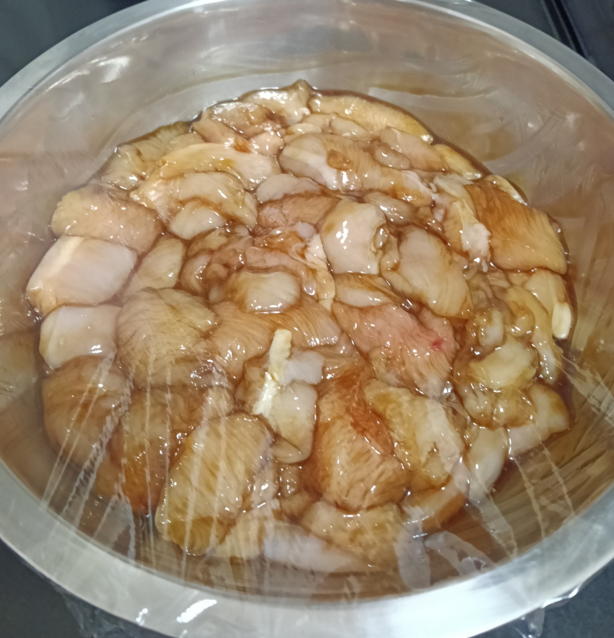 ล้างทำความสะอาดอกไก่ หั่นเป็นชิ้นพอดี หมักด้วยซอสหอยนางรม ซีอิ๊วขาว น้ำมันงา ใส่ตู้เย็นไว้ 1 คืน