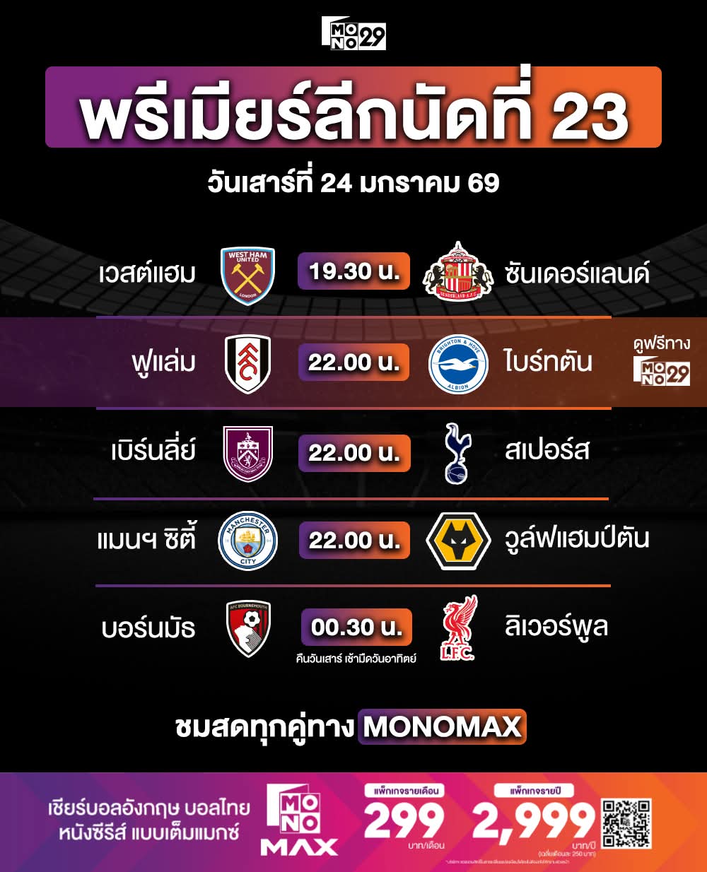 ⚽🏴 โปรแกรมพรีเมียร์ ลีก 2025/26 แมตช์ที่ 23 🗓️ วันเสาร์ ที่ 24 มกราคม 2569 📺 #MONO29 #MONOMAX 🔴