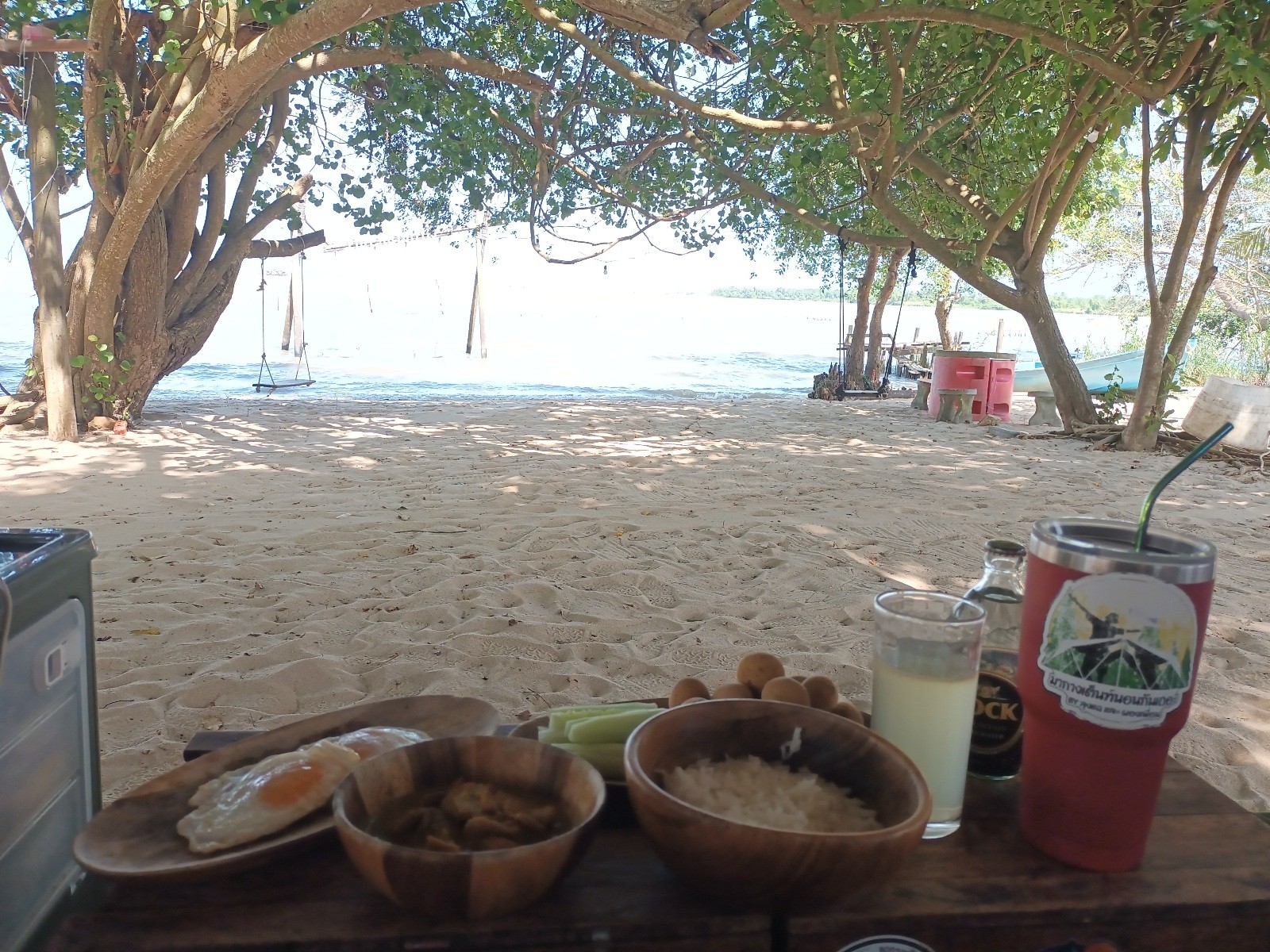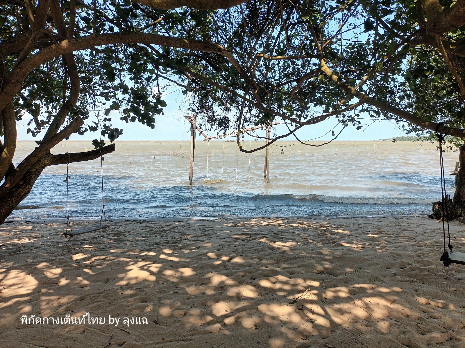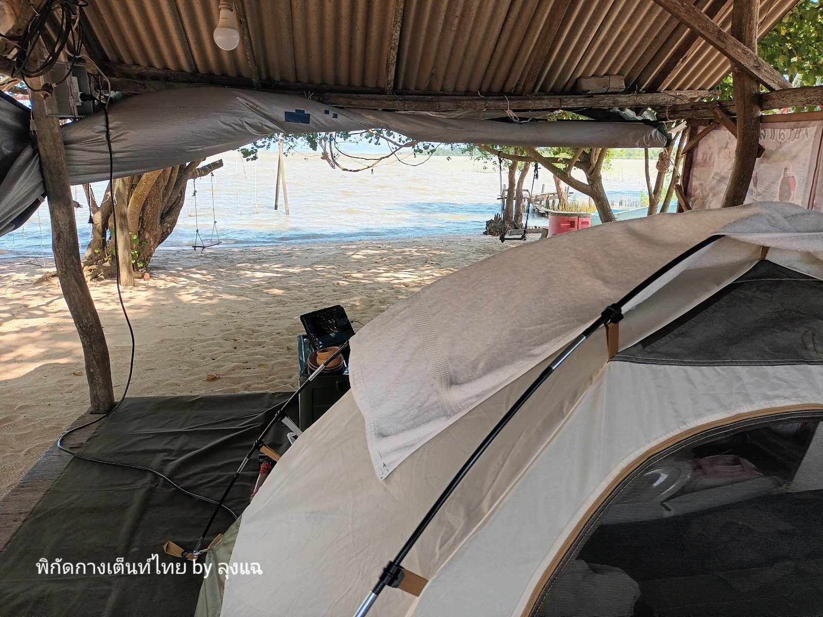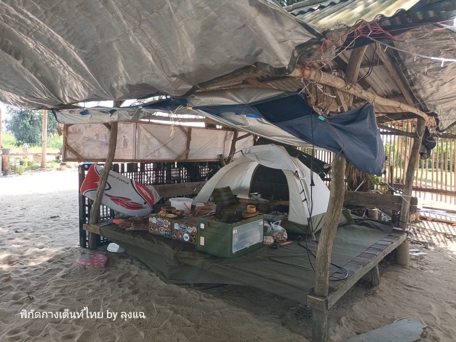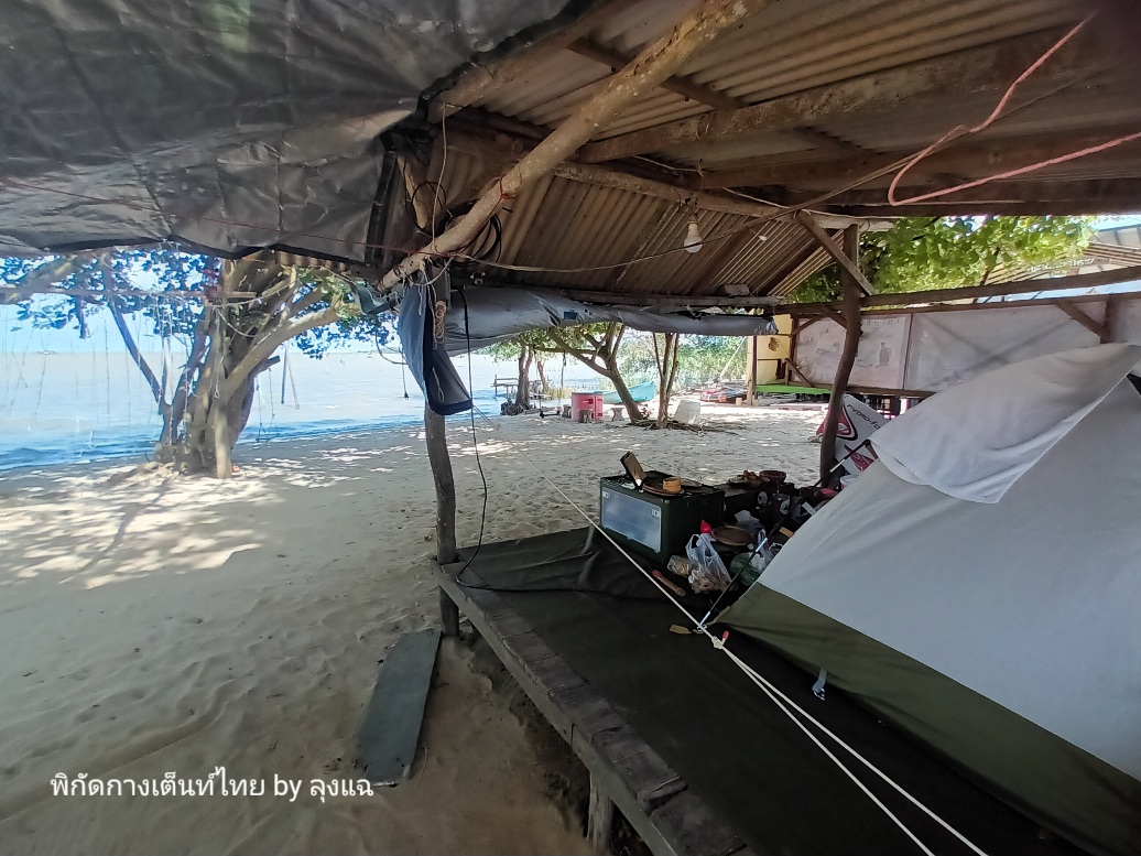 คลื่นลมแรง เลือกกางบนศาลาโล่ง จอดรถใกล้ๆ ขนของง่าย รีบจัดบ้านและใช้ทาร์ปผืนเล็กปิดด้านหน้าเพื่อบังลม ไม่งั้นทำกับข้าวไม่ได้ และเต็นท์อาจบาดเจ็บ