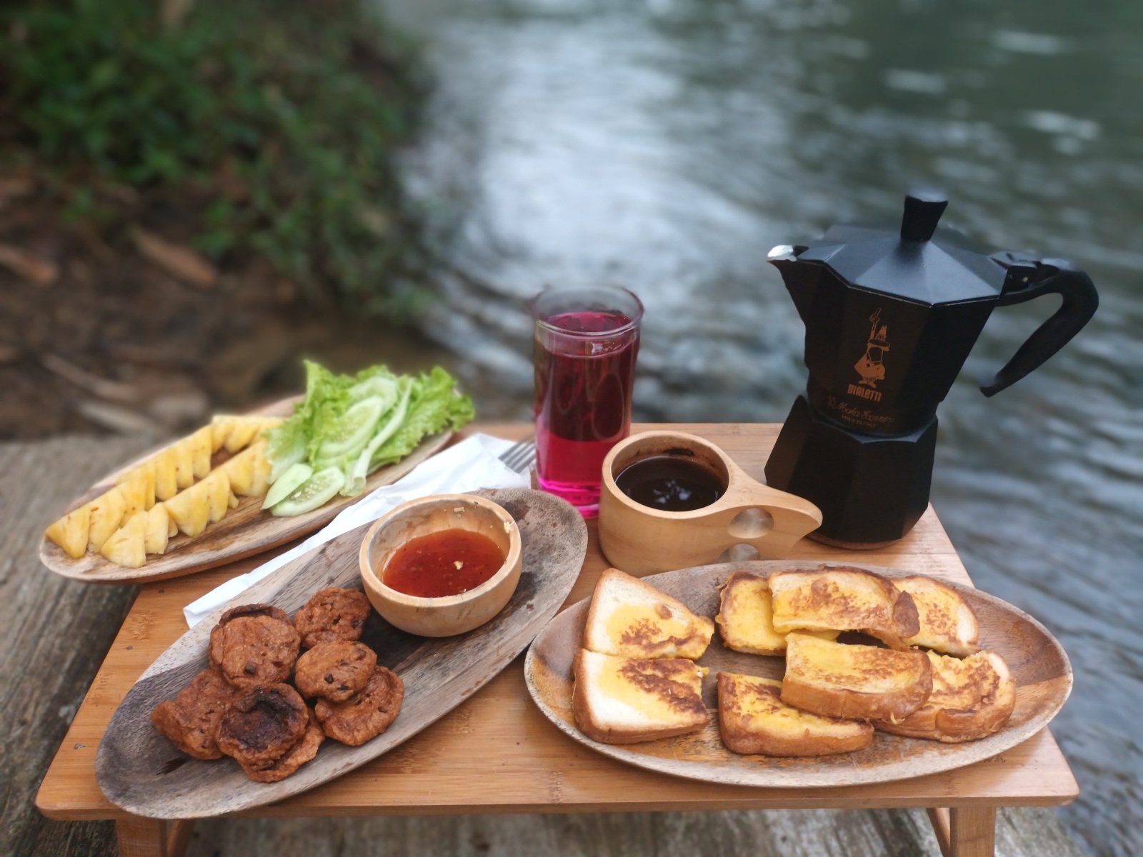 ตื่นตี 5 ครึ่ง เก็บผ้าห่ม เบาะรองนอน แล้วออกมาเตรียมมื้อเช้า ฟ้ายังมืด จน 6 โมงกว่า จึงพอจะสว่างขึ้น