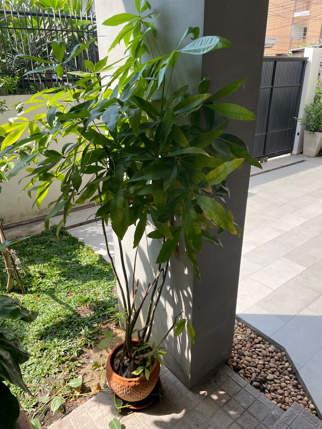 บ้าน 45 ตารางวา หน้ากว้าง 9 เมตร ด้านหนึ่งเป็นที่จอดรถ อีกด้านเป็นพื้นดินเปล่าไว้ทำสวน ผมมีต้น"ตีนเป็ดทราย"ปลูกอยู่ในกระถาง สูง 120 cm ได้ (ผมขุดมาจากดิน ขึ้นอยู่ข้างๆต้นแม่) ถ้าจะปลูกลงดิน