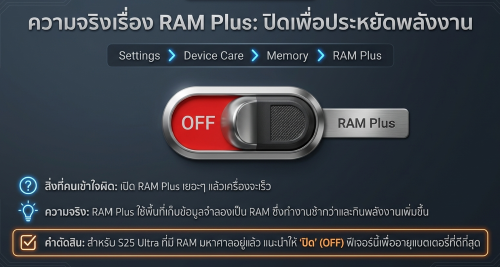 เหตุผล: RAM จริงของเครื่องมีความเร็วสูงกว่า RAM เสมือน ที่ดึงมาจากพื้นที่เก็บข้อมูลอย่างมหาศาล สำหรับเครื่องที่มี RAM เพียงพออยู่แล้ว การเปิด RAM Plus ก็เหมือนเอารถสปอร์ตมาต่อท้ายรถพ่วง — นอกจากจะไม่ได้ช่วยให้เร็วขึ้นแล้ว ยังทำให้เครื่องหน่วงลงและกินแบตเพิ่มโดยไม่จำเป็น