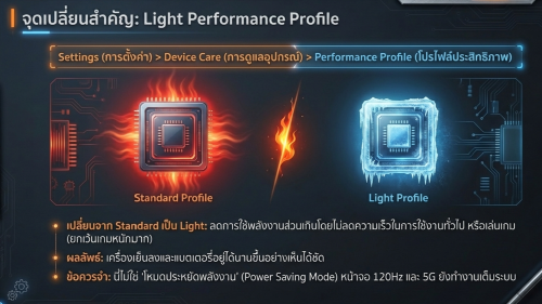 นี่คือหนึ่งในฟีเจอร์เด็ดที่ซ่อนอยู่ใน One UI ซึ่งหลายคนอาจไม่เคยรู้มาก่อน "โปรไฟล์ประสิทธิภาพแบบเบา" หรือ Light Mode เป็นคนละอย่างกับโหมดประหยัดพลังงาน (Power Saving Mode) แต่มันคือการปรับจูนการทำงานของ CPU ให้เน้นไปที่การประหยัดพลังงานและควบคุมความร้อนเป็นหลัก โดยจะจัดลำดับความสำคัญของคอร์ประหยัดพลังงาน (efficiency cores) และลดความเร็วสัญญาณนาฬิกาสูงสุดของ CPU ลงเล็กน้อย ซึ่งแทบไม่ลดทอนประสิทธิภาพในการใช้งานทั่วไปเลย