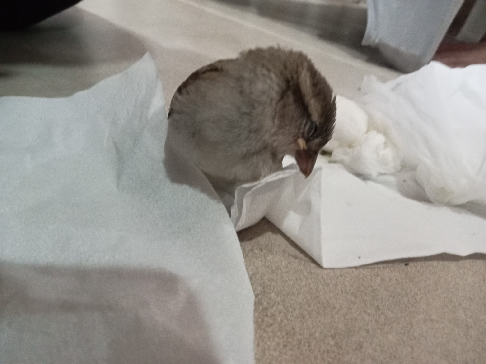 เมื่อวานนกตัวนี้ถูกอีกาจิกกัดตกลงมาจากหลังคาชั้นสองมาค้างที่หลังคาชั้นล่าง (ตกมาหนึ่งชั้น) พอไล่อีกกาไปได้ก็จับนกตัวนี้ลงมาดูมันยังงง ๆ คงเพราะตกลงมากระแทกหลังคา ดูอาการเจ้าอีกาแล้วคงจะจับนกตัวนี้กินแ