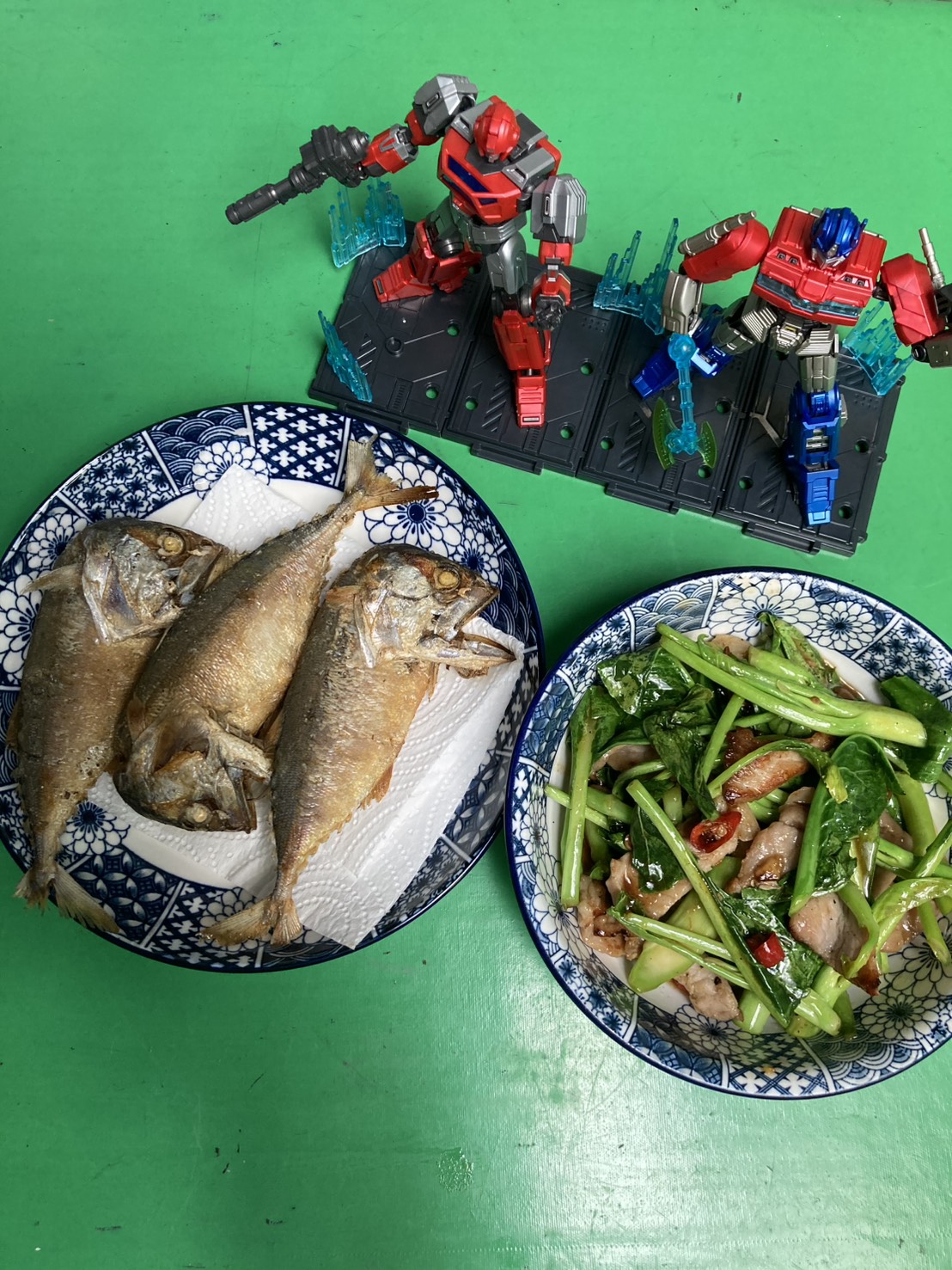 ปลาทูทอด คะน้าผัดหมู กินกับข้าวต้ม บัวลอยน้ำขิง
