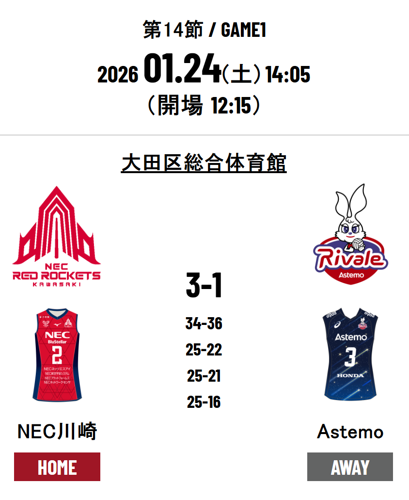 NEC Red Rockets Kawasaki 3 - 1 ASTEMO Rivale Ibaraki