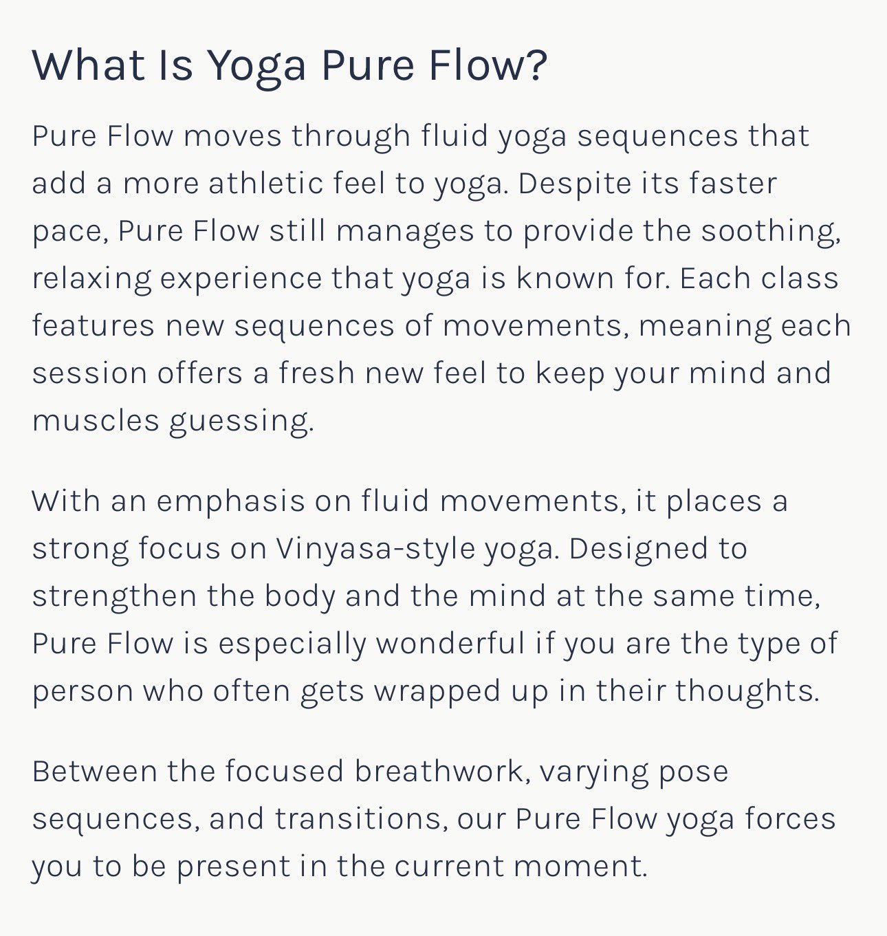 ด้วยการเน้นการเคลื่อนไหวที่ลื่นไหล Pure Flow จึงให้ความสำคัญกับโยคะแบบวินยาสะ (Vinyasa) เป็นหลัก ออกแบบมาเพื่อเสริมสร้างทั้งร่างกายและจิตใจไปพร้อมกัน Pure Flow เหมาะอย่างยิ่งสำหรับคนที่มักจะเผลอจมอยู่กับความคิดของตัวเองบ่อยๆ