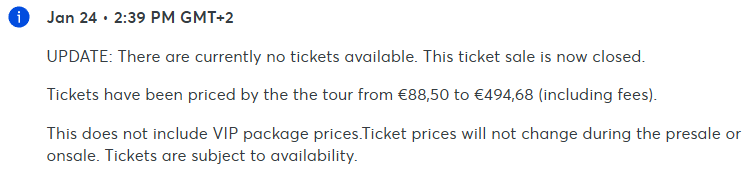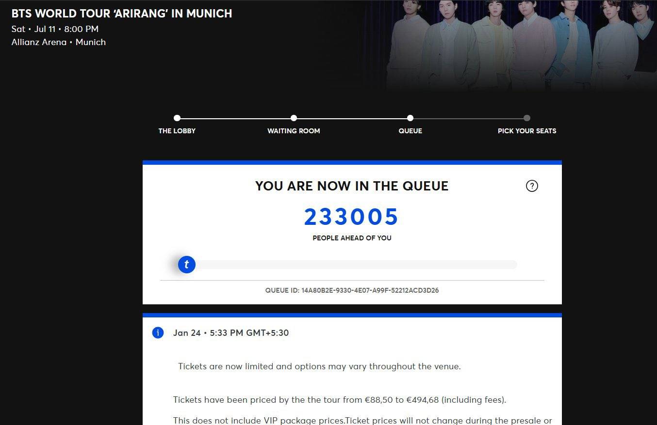 บัตรคอนเสิร์ต Arirang ของ BTS ที่ สนาม Allianz Arena เมืองมิวนิก ซึ่งเป็นสนามเหย้าของสโมสรบาเยิร์น มิวนิก ความจุสำหรับการจัดคอนเสิร์ตประมาณ 75,000 ที่นั่งต่อรอบ ทั้งสองวัน SOLD OUT แล้วอย่างเป็นทางการ หลังจาก 39 นาทีที่เปิดให้จองในรอบทั่วไป โดยได้รับการยืนยันจาก Ticketmaster ซึ่งมีคนเข้าคิวรอกว่า 2 แสนคน