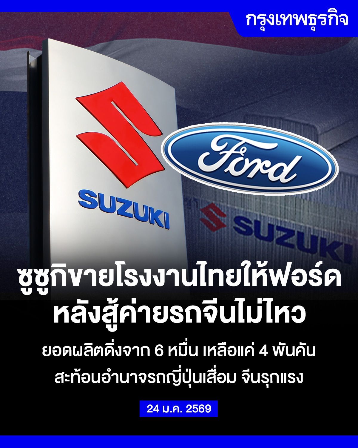 ซูซูกิขายโรงงานไทยให้ฟอร์ด หลังสู้ค่ายรถจีนไม่ไหว ยอดผลิตดิ่งจาก 6 หมื่น เหลือแค่ 4 พันคัน สะท้อนอำนาจรถญี่ปุ่นเสื่อม จีนรุกแรง