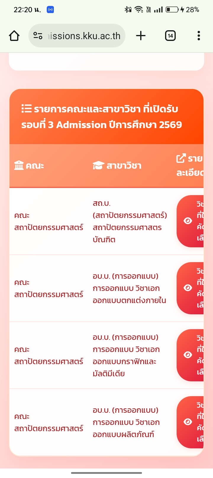 คือเราเข้าไปดูเกณฑ์พอร์ตของคณะสถาปัตย์ มข. มา พอกดเข้าดูสาขาที่รับสมัครแล้วมันไม่เจอสาขาสถาปัตย์หลักเลย อยากรู้ว่าเขารับเเค่สาขาออกแบบเหรอ?