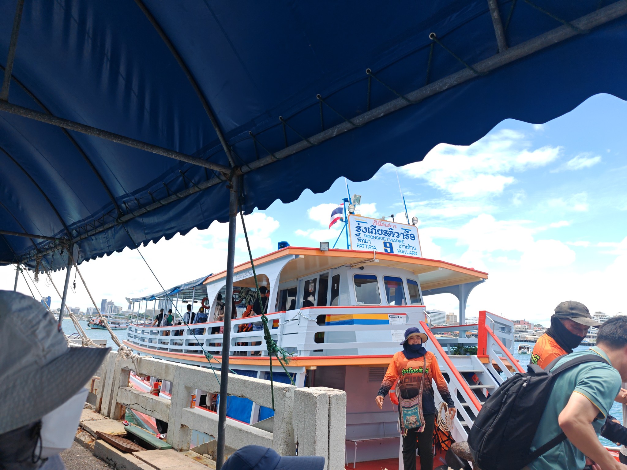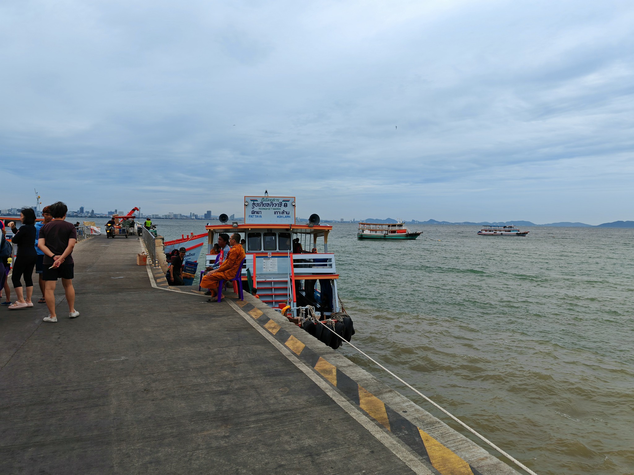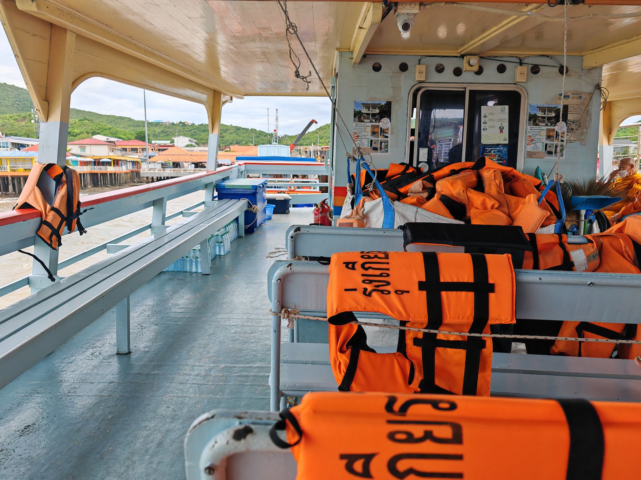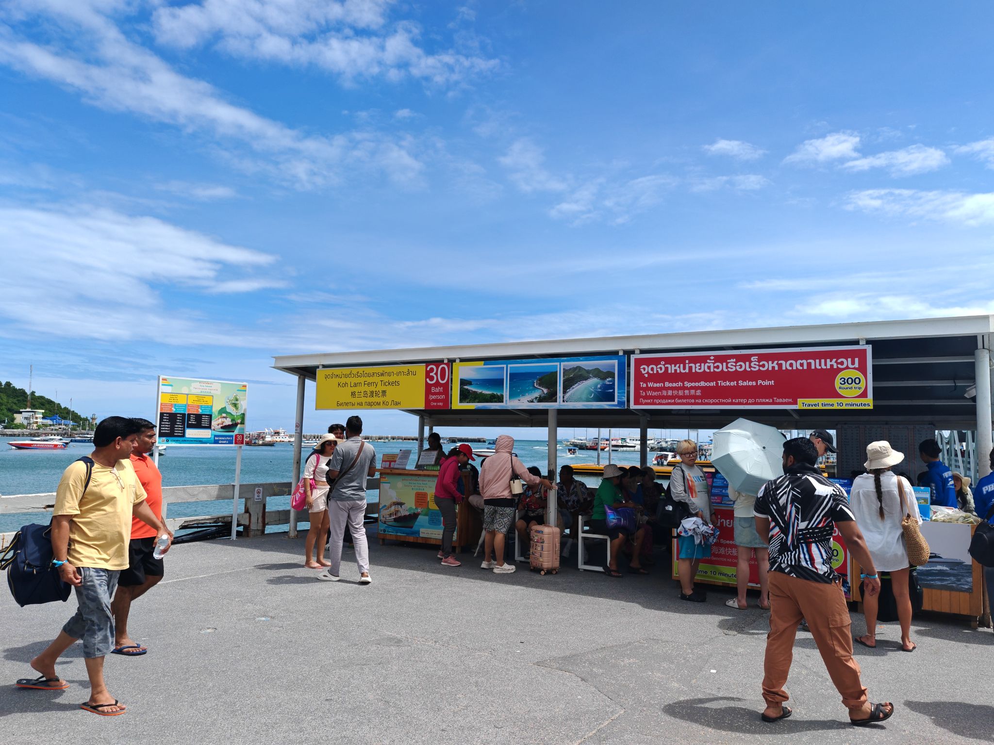 เดินไปท่าเรือดูตารางเรือไปท่าหน้าบ้าน ดูจากคลื่นลมแล้วขอเลือกเรือใหญ่แล้วกันซื้อตั๋วที่หน้าเรือได้เลย