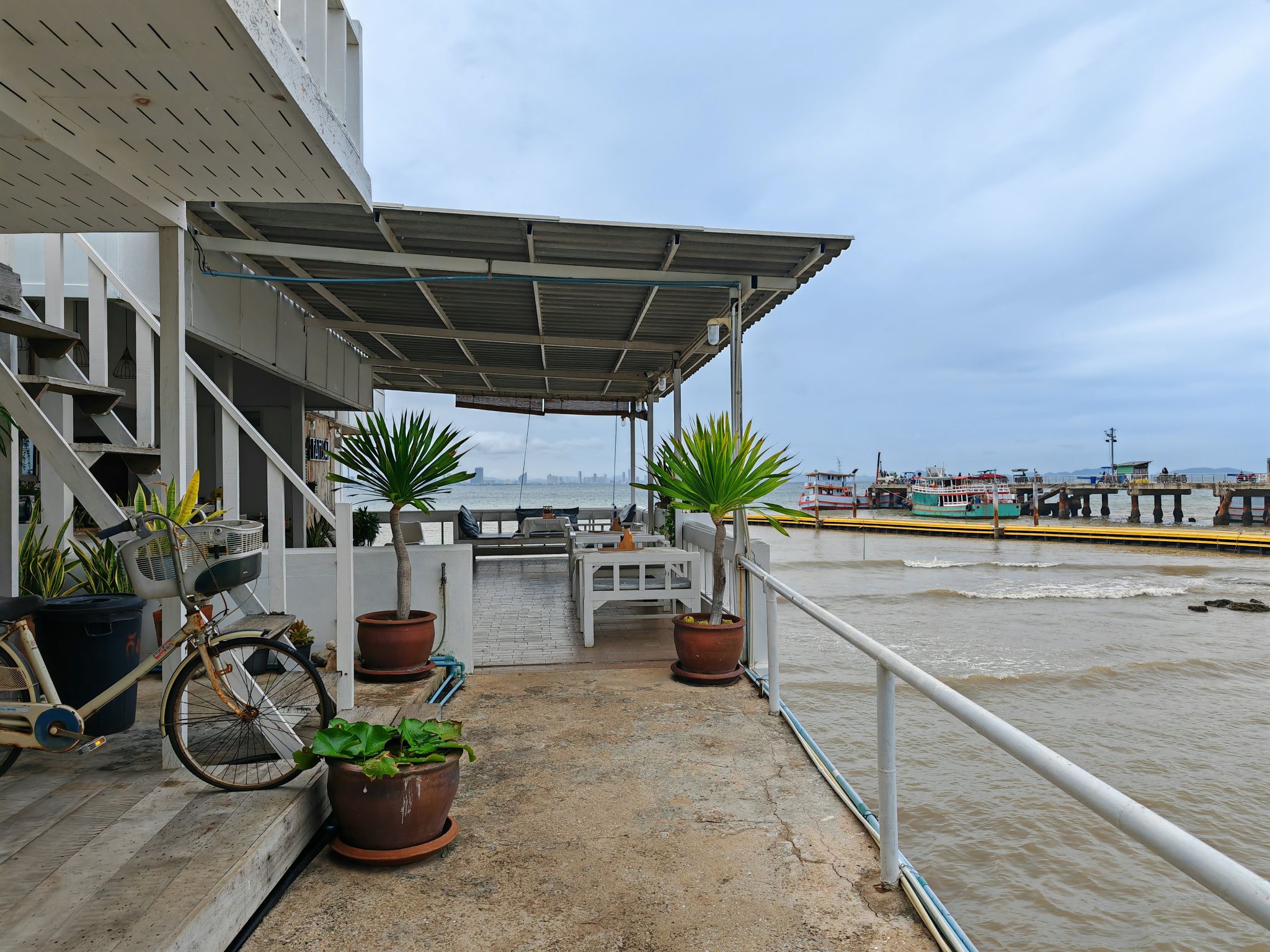 โต้ลมสักพักก็มาถึงท่าหน้าบ้าน เราพักที่บ้านฟ้าใสหลังสีขาวหลังคาแดงที่ยื่นอยู่ในทะเลนั่นเลยค่ะ