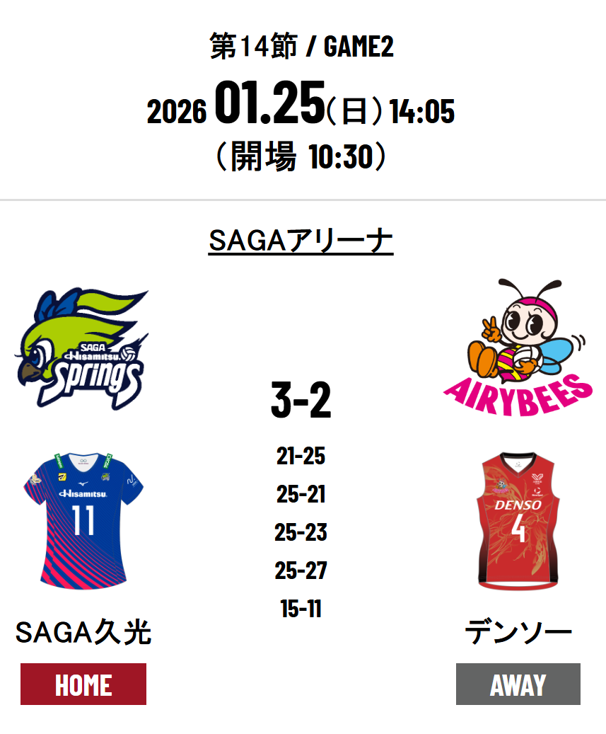 SAGA Hisamitsu Springs 3 - 2 DENSO Airybees