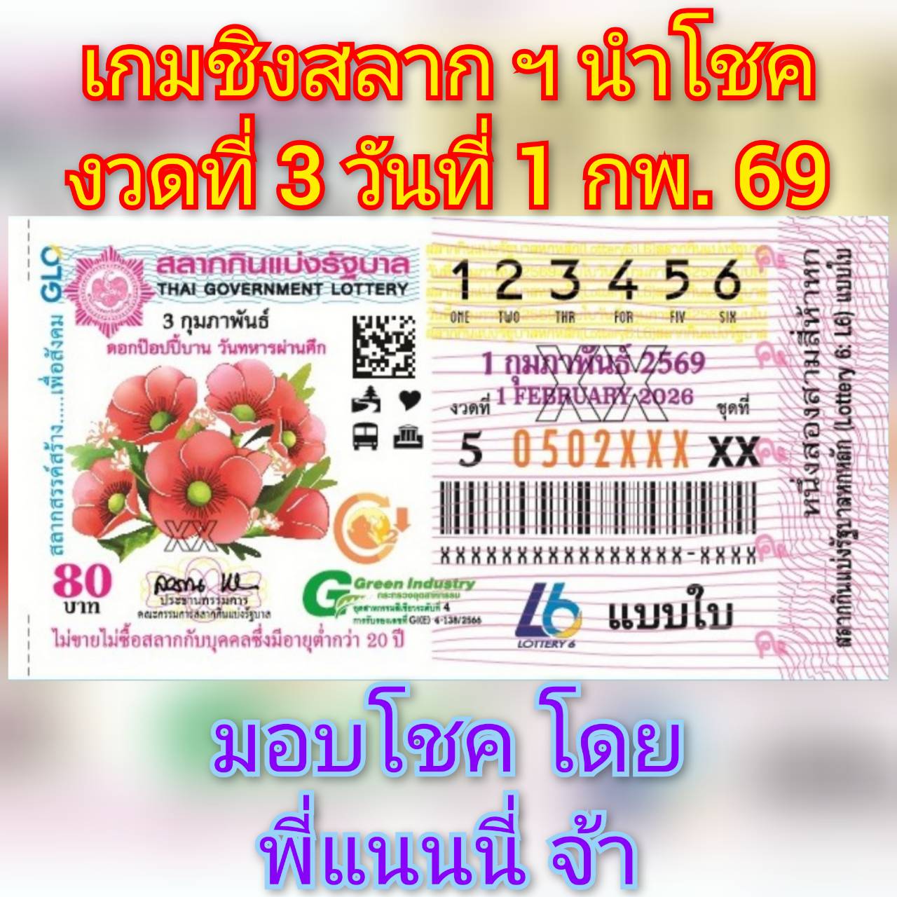 รางวัล :- สลาก ฯ นำโชค งวดที่ 3 วันที่ 1 กุมภาพันธ์ 2569 จำนวน 3 รางวัล ๆ ละ 3 ใบ และ กิตติมศักดิ์ 1 รางวัล คือ น้องแหลม (ขุนโจรป่า ฯ) ครับ