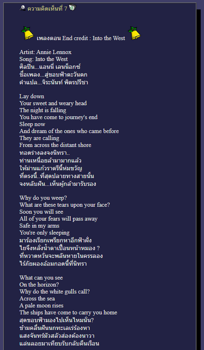 [Spoil] คลิกเพื่อดูข้อความที่ซ่อนไว้แถมพิเศษ ผลงานของคุณจิระนันท์ พิตรปรีชา จากกระทู้ในอดีต (คอมเม้นต์ที่7) ..... รวมรวมบทกินใจ LOTR : ROTK สุดยอด!!!