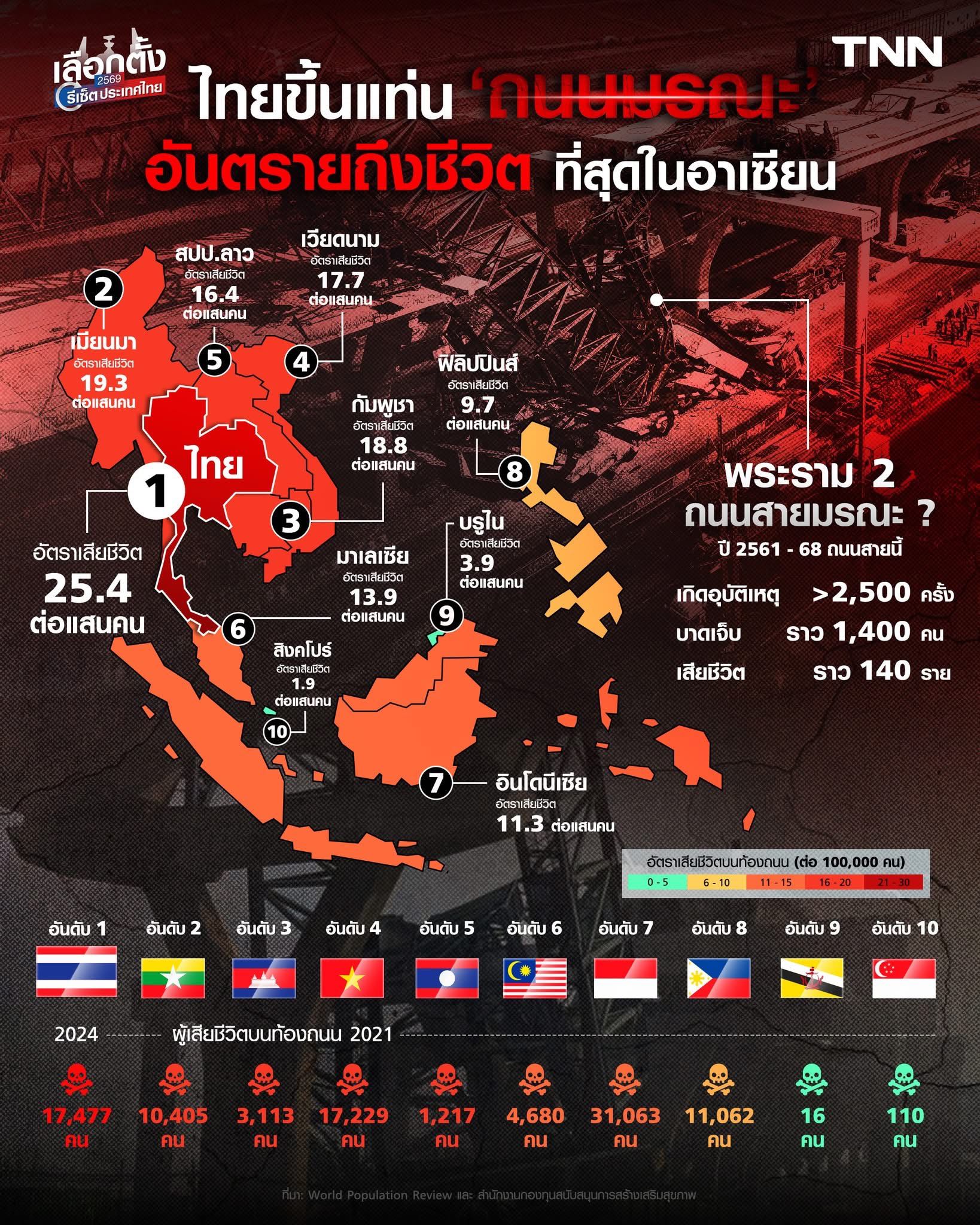 จะพบว่า ประเทศไทย มีอัตราเสียชีวิตบนท้องถนนมากที่สุดอันดับ 1 คือ 25.4 คนต่อประชากร 1 แสนคน